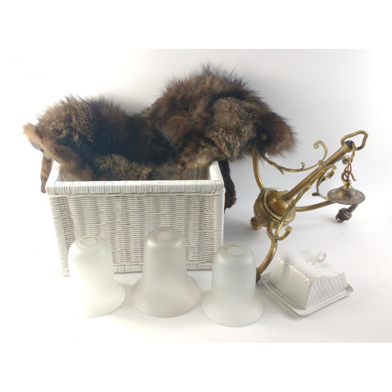 A vintage brass ceiling light fixture with 3 branches, approx 40cm long with also 3 bell-shaped opaque glass shades. Also includes a butter dish, a fur stole and a white painted wicker basket