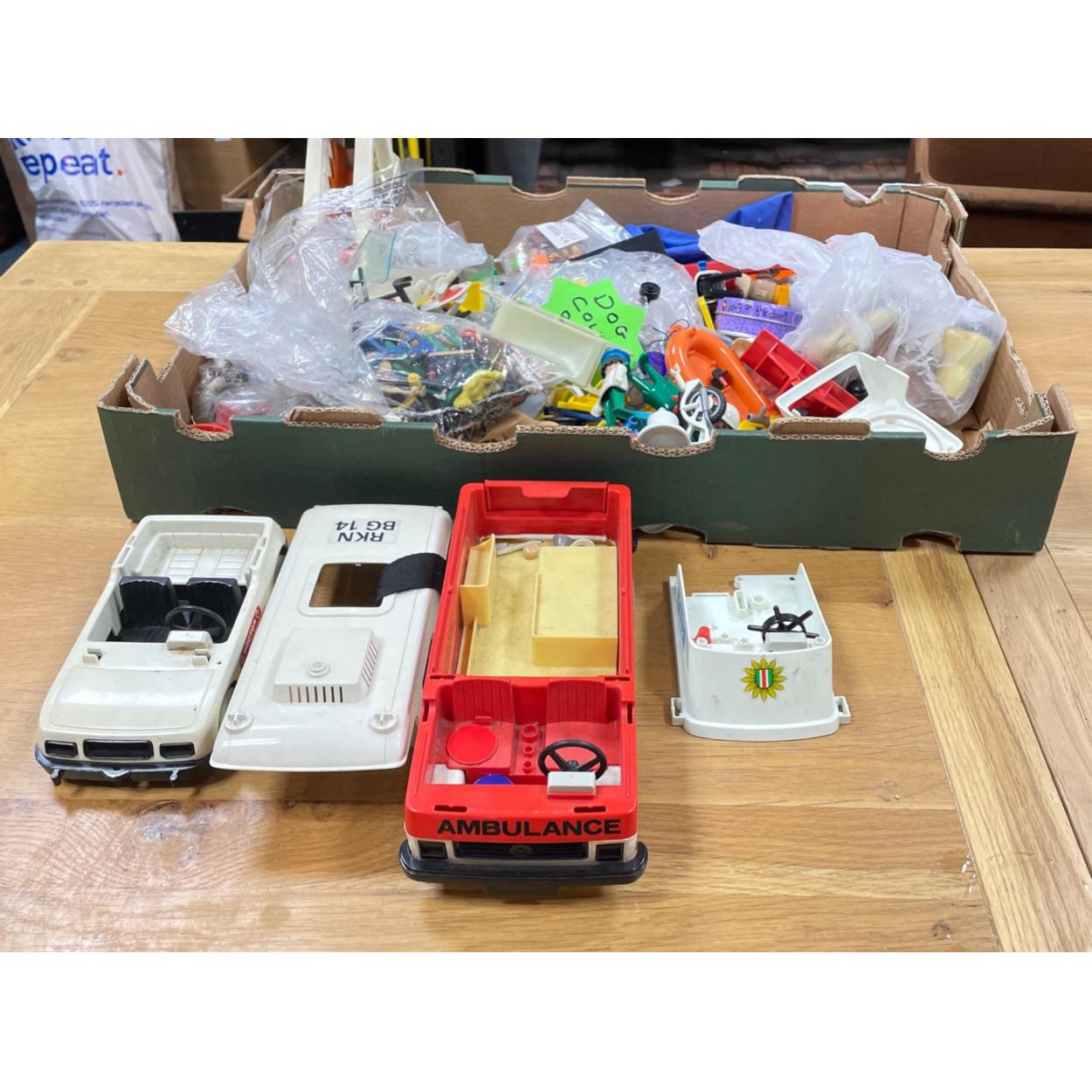 A box of plastic toys including some PLAYMOBILE pieces. A nice lot, fun to sort through.