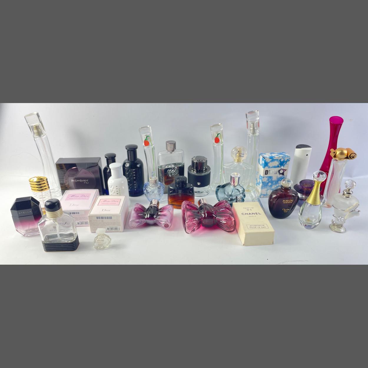 A box containing a great collection of quality empty perfume bottles. Some still in boxes. Great makes such as DIOR, HUGO BOSS, GUCCI etc.