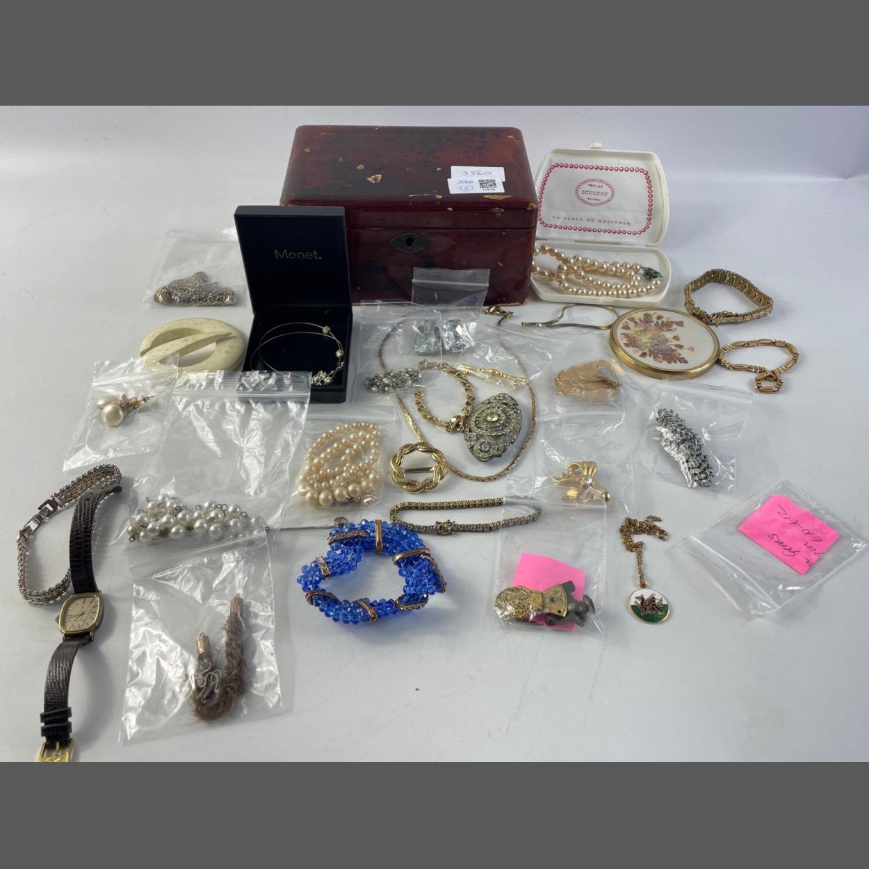 A nice ebonised jewellery box containing a selection of costume jewellery including pearls, bracelets, brooches, plated chains and includes a pretty MONET necklace. An interesting lot.