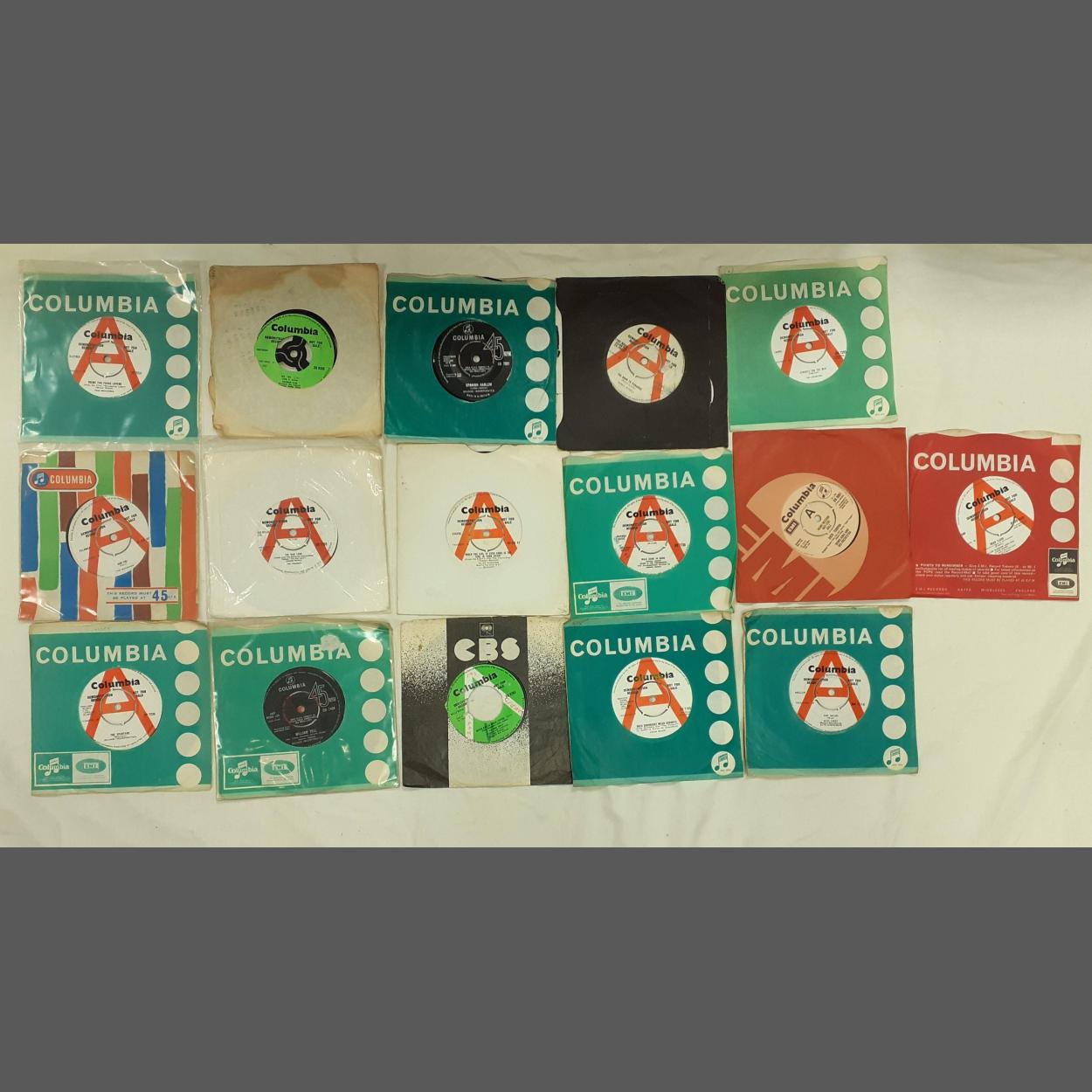 A collection of 16 discs from the COLUMBIA recording company - Demonstration Sample Not For Sale - 45rpm vinyl records from the 1960s, and 70s to include Solomon King, the Rag Dolls, Sounds Incorporated, and The Shadows among others.
