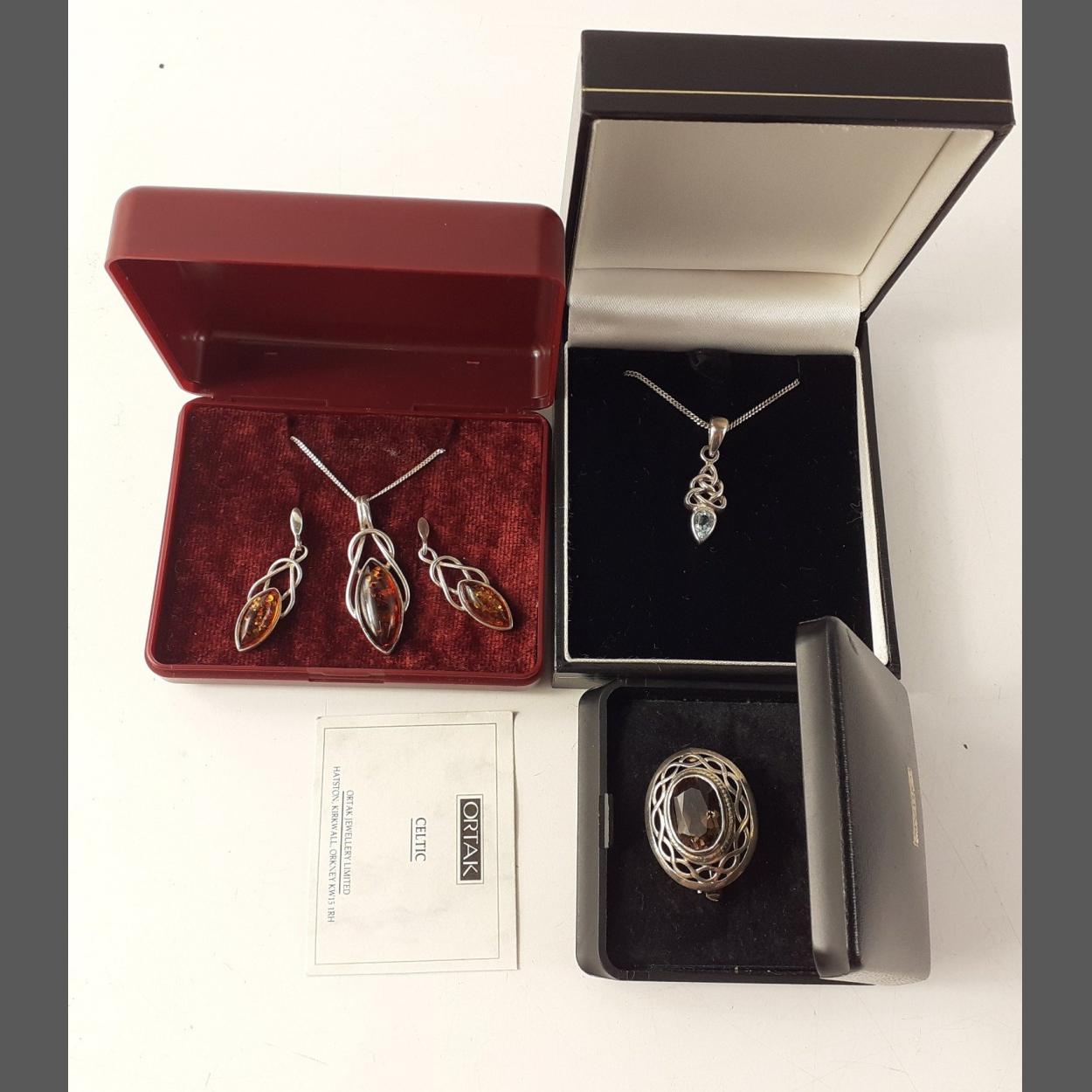 Three pieces of Celtic flavoured jewellery to include a chain 44cm long, stamped 925 with a pendant 3cm long set with a blue stone, a brooch set with a smokey stone 3cm long, stamped 925, and a set of necklace and earrings stamped 925, chain 46cm, earrings 3cm set with amber coloured stones, gross weight 14.65g
