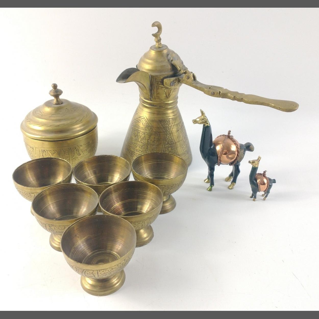 A small lot of asian brassware to include chocolate pot, trinket bowl, six small bowls and a pair of llamas