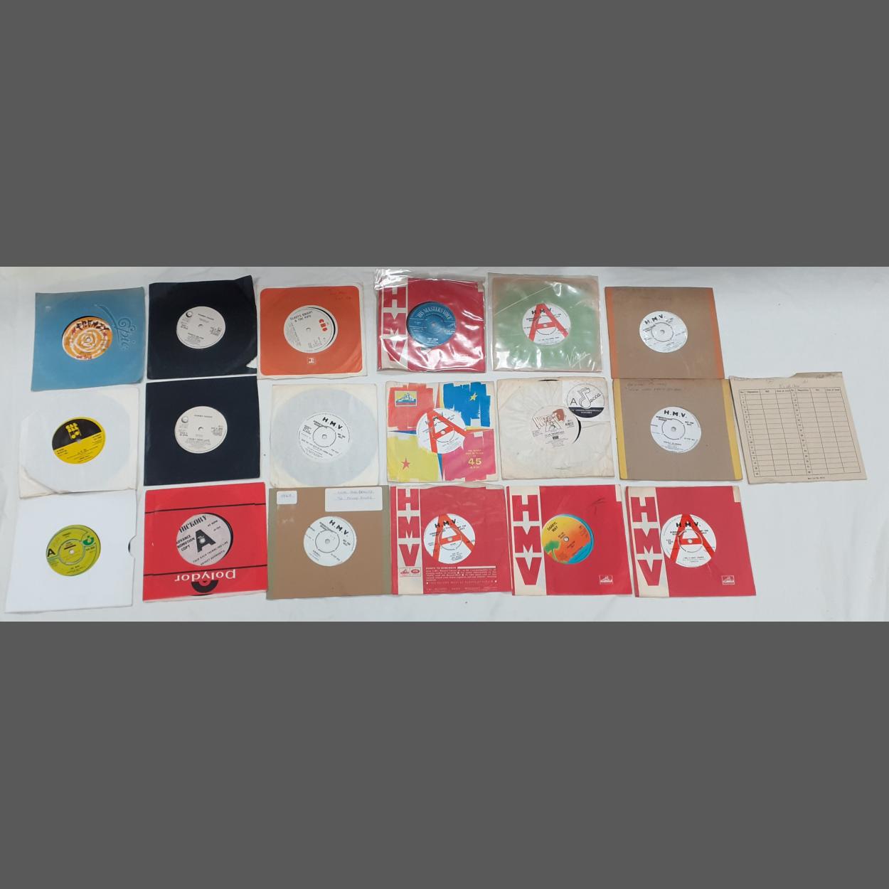 An interesting collection of 19 various artists from the following recording companies - CBS, FRENZY/EPIC, GEE BEE, GEFFEN, HARVEST, HICKORY, and H.M.V. - Demonstration Sample Not For Sale - 45rpm vinyl records from the 1960s, 70s and 80s to include OK. Jive, Mike Gill, Sammy Hagar, The Move, and Frankie Davidson and The Planets among others.