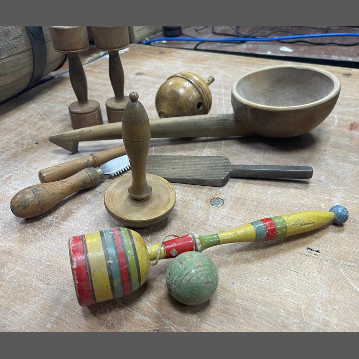 A collection of VINTAGE TREEN items to include a small butter pat and a vintage child's game ball and cup etc