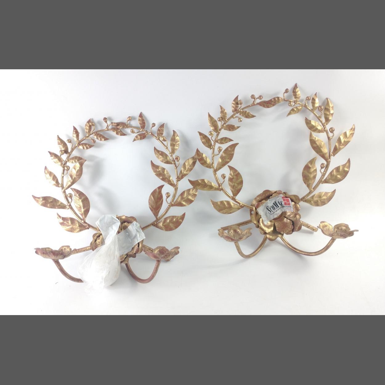 A pair of copper and gold-coloured wall sconces shaped like a wreath to hold 2 candles, 36cm long, come with fittings