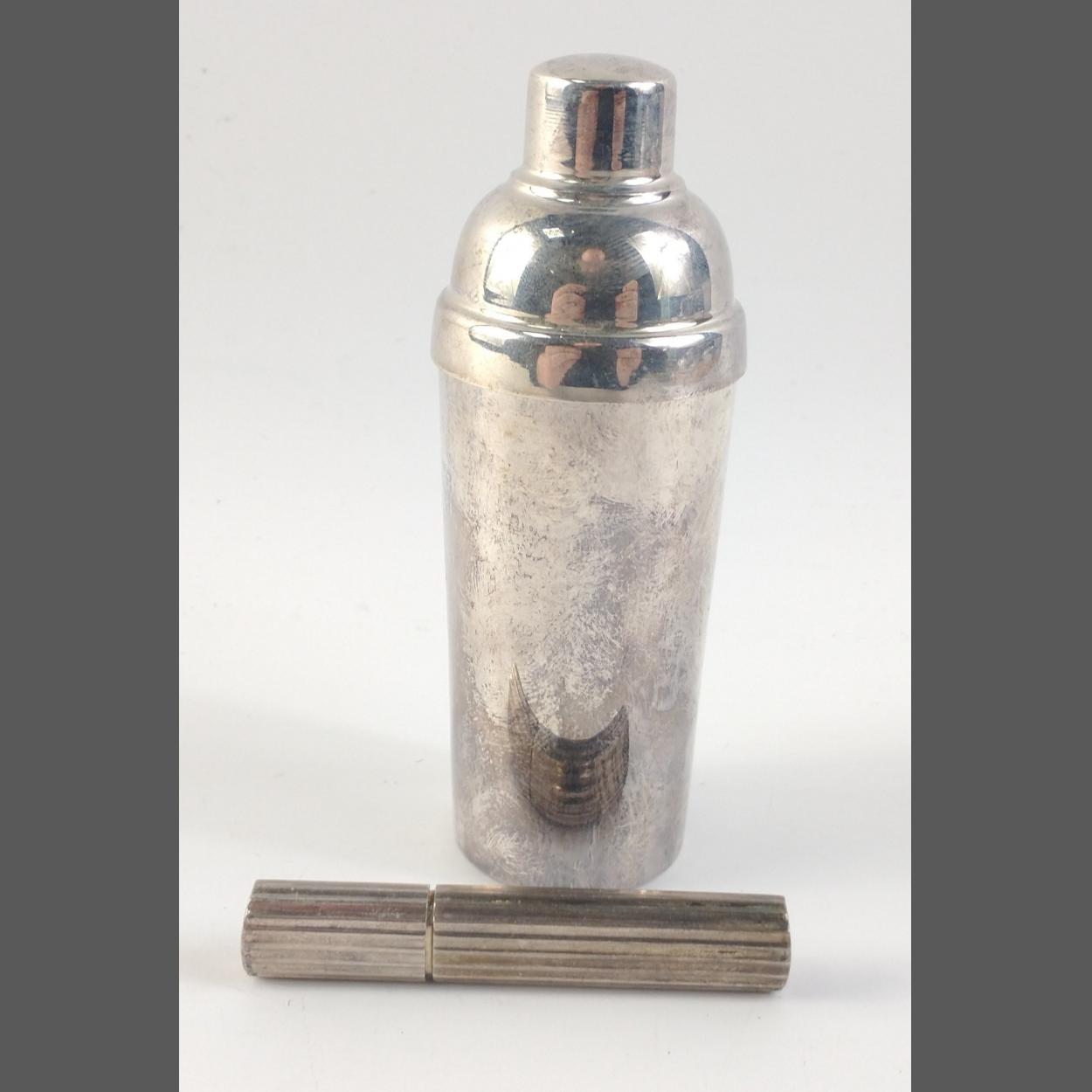 A MAPPIN & WEBB stamped small lidded tooth pick holder in cocktail shaker form - height 10cm approx with a silver P&K stamped Birmingham tooth pick holder 12.87g approx