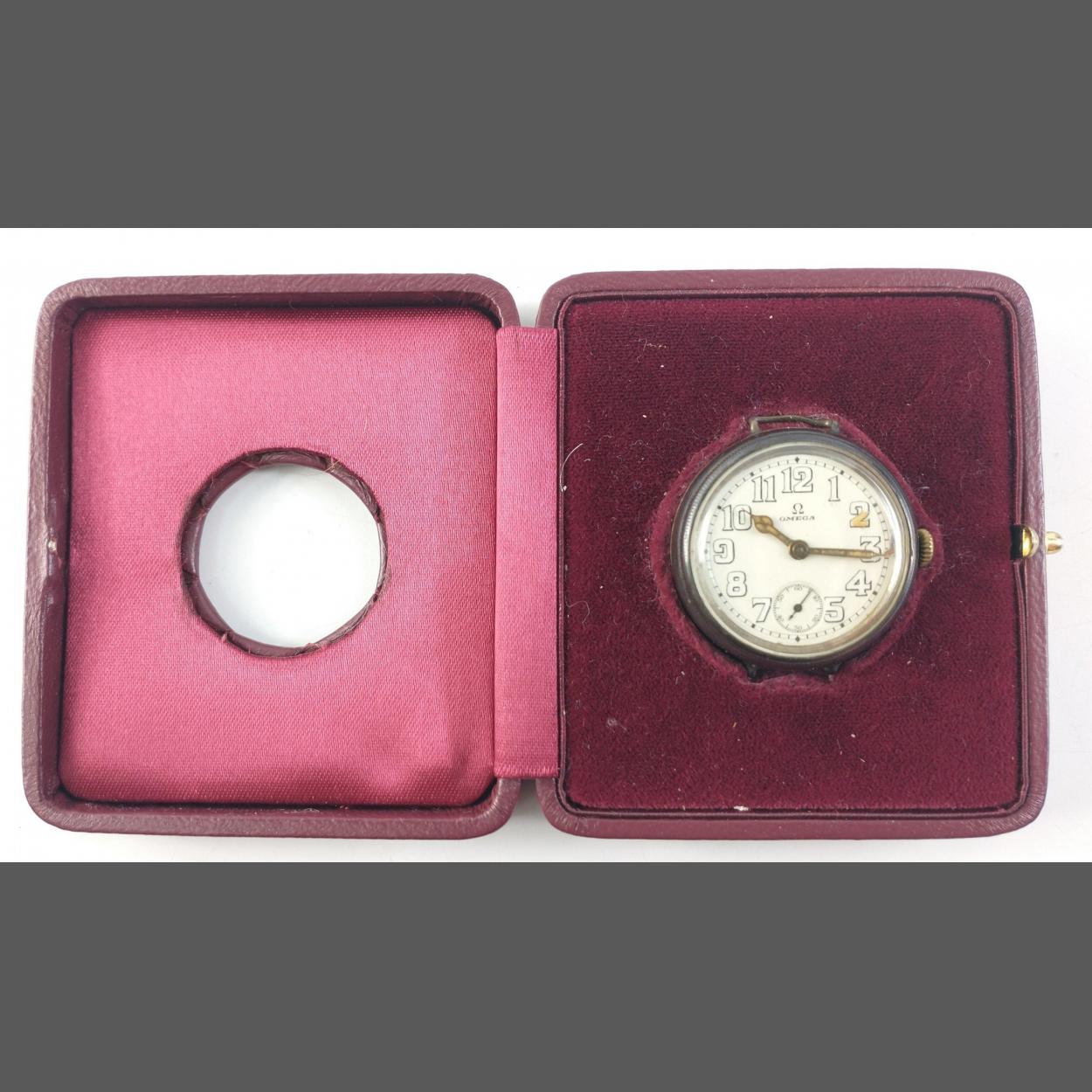 An early OMEGA officers Trench wrist watch with second sub dial in white metal, (possibly silver?) within original presentation night stand display case. Lacking strap and not currently running. Gross weight 34.72g approx