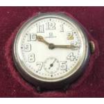 An early OMEGA officers Trench wrist watch with second sub dial in white metal, (possibly silver?) within original presentation night stand display case. Lacking strap and not currently running. Gross weight 34.72g approx