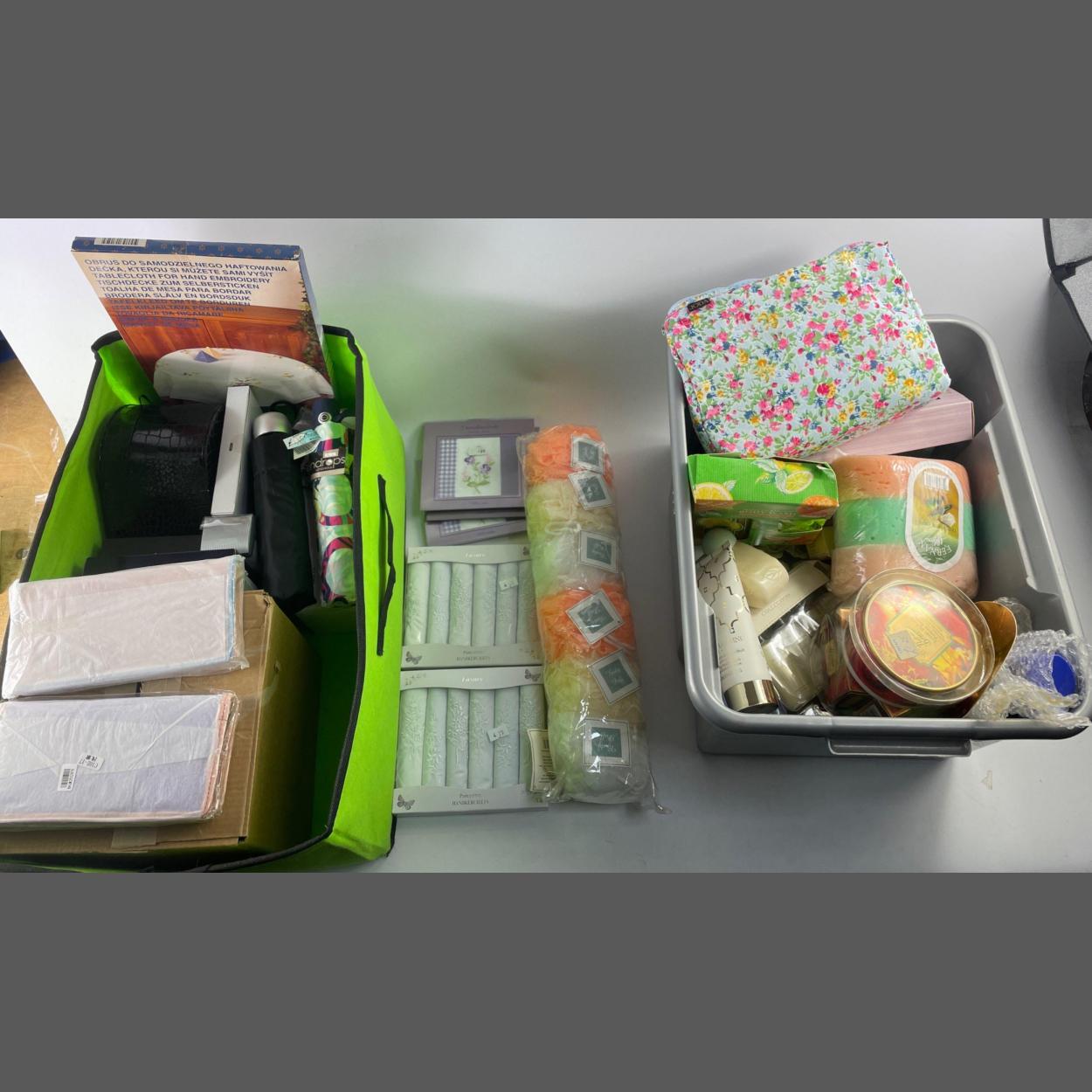A real mixed lot of new items including leather purses and wallets, packs of new handkerchiefs, an UNUSED black lockable EVIE MAI make-up box, TRINKET BOXES, brollies, plus a box full of toiletries including a BAYLISS & HARDING toilet bag with weekend size shower gel etc, shower puffs, sponges and much more,