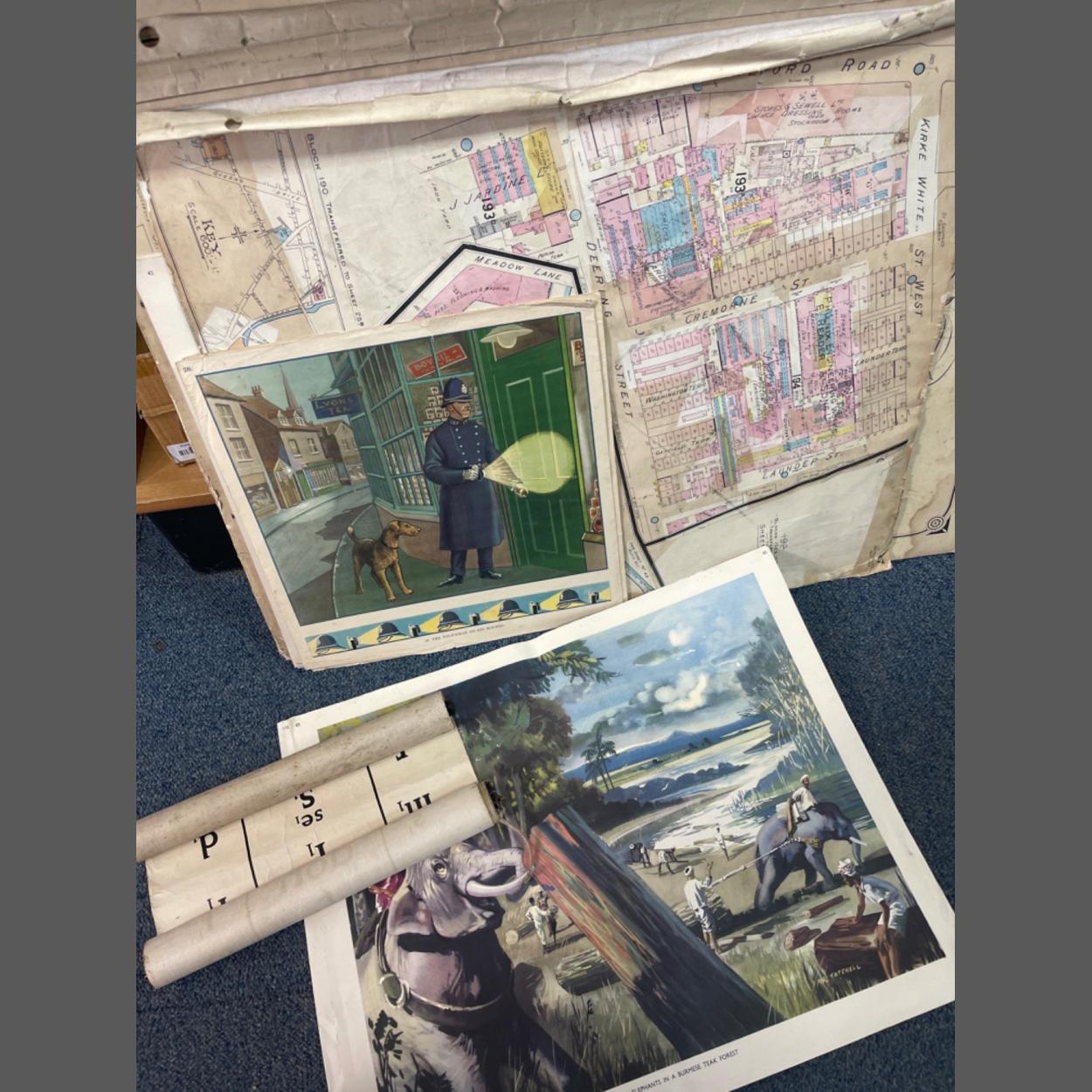 A collection of old maps to include an old street maps, Curwen's vintage musical wall chart