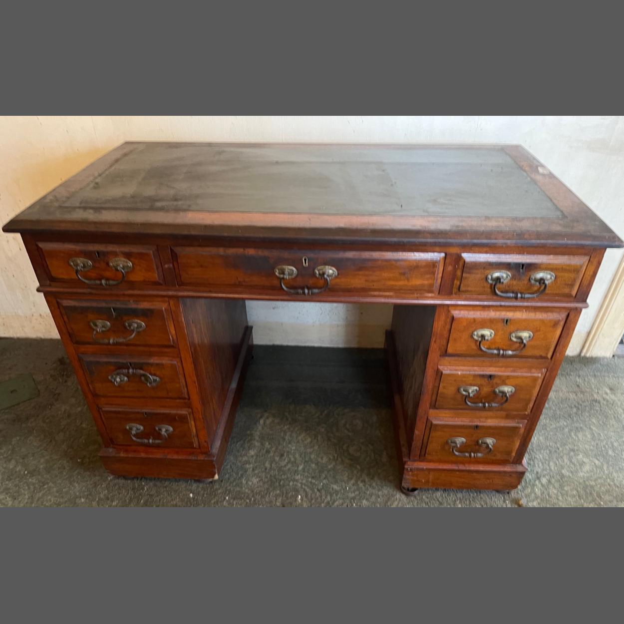 A quality EDWARDIAN green leather-topped kneehole desk with eight drawers and a ninth central drawer - the desk sits on tiny brass castors - this piece comes in three pieces for ease of transport etc - dimensions 106cm wide 60cm depth x70cm height appro