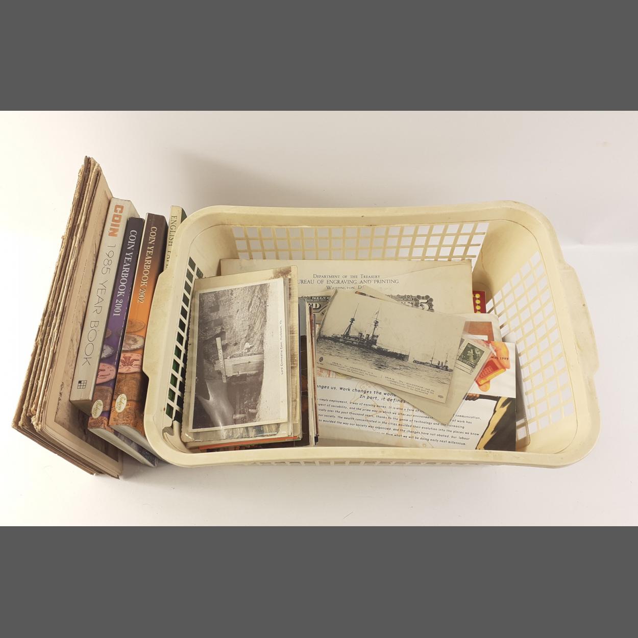 A small collection of ephemera and stamps to include older coin books, a few programmes and some modern stamps.