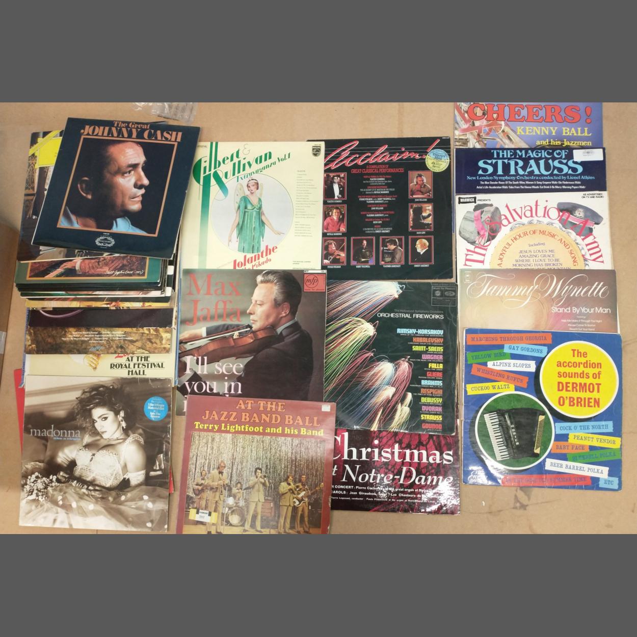 A collection of 27 x 33rpm vinyl records of mixed genres including Classical, Country, Folk, and Musicals including artists such as Gilbert & Sullivan, Kenny Ball, Dermot O'Brien, Andre Previn, Scott Joplin and Tammy Wynette among others.