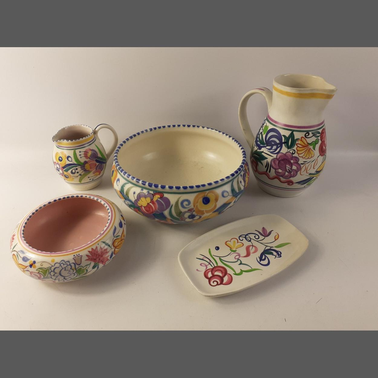 A small collection of highly colourful and attractive POOLE POTTERY to include jug standing 19cm high. a bowl marked 425/ED measuring 20cm diameter, a pot pourri dish 221/BN 15cm across, a small milk jug marked 305 and a small dish 18cm long. All in good undamaged condition except the large jug which has a small rim chip.