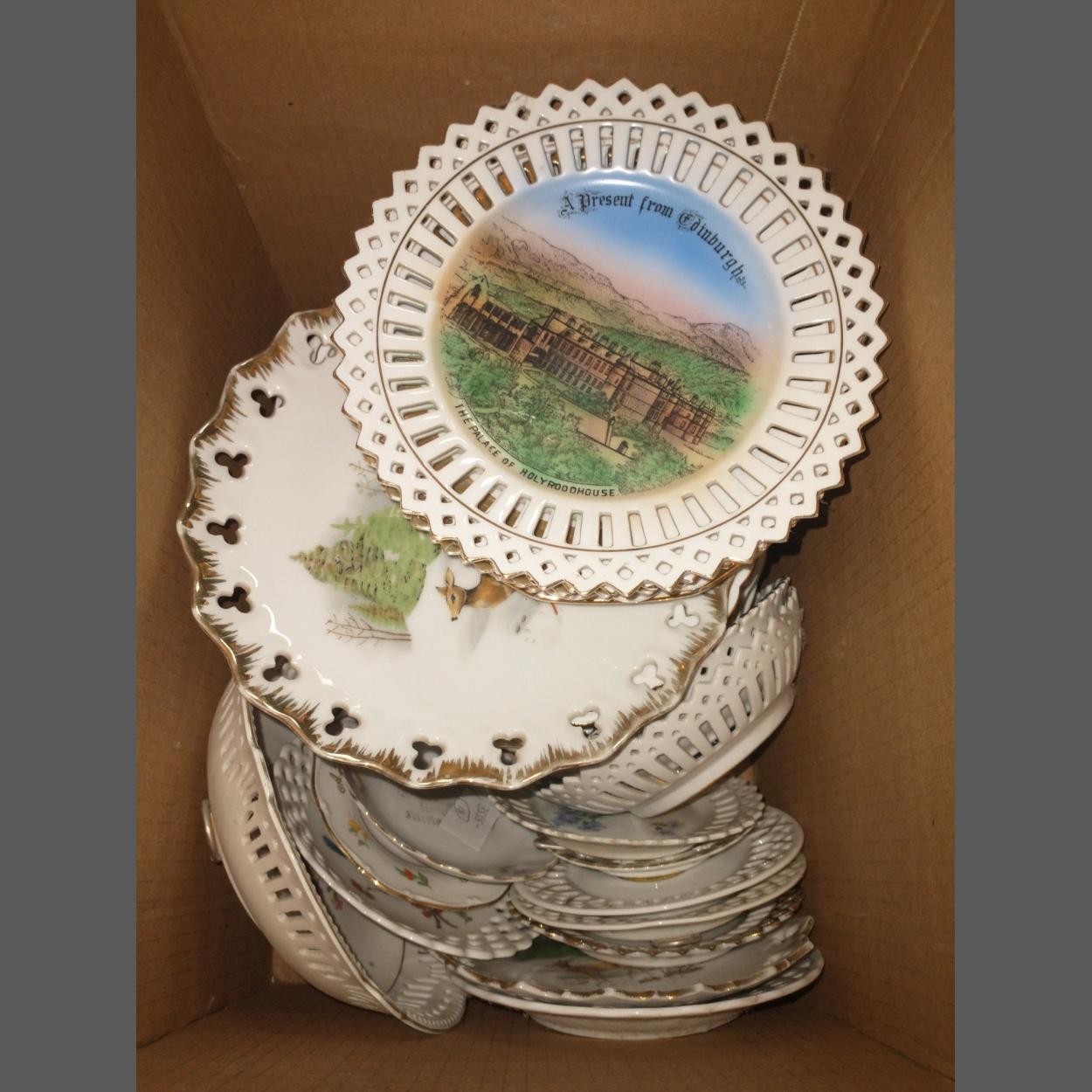 A large collection of decorative plates mostly with cut-out design on edges and many commemorating various places around Scotland and abroad