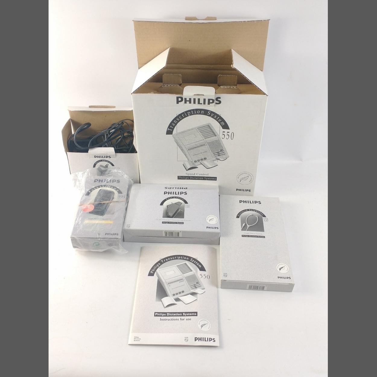 A Philips Transcription System 550 - a Dictation / Dictaphone set including Transcription machine, mains adaptor, Standard Earphones, Pocket Memo Dictaphone with two tape cassettes and a Foot Control along with instruction booklet.