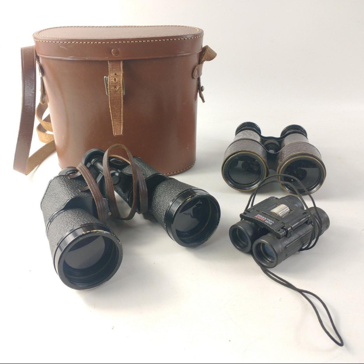For BIRDLOVERS And HILLWALKERS! Three pairs of binoculars. The Jumelle Marine binoculars have issues to the casing with a tape repair to binding and loose spindle but the lenses are fine and focus good. The Colemont Telestor (Paris) - lightweight 10 x 50 Coated lenses - comes with an original leather case. The Praktica SPORT 8 X 21A binoculars are pocket-sized without an original casing.
