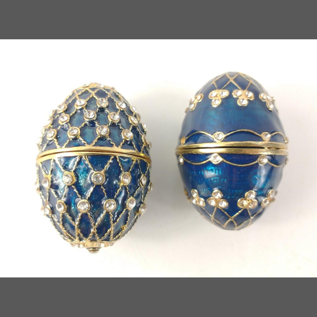 Two FABERGE style eggs approx 7cm long with magnetic catches (2 small stones missing from one)
