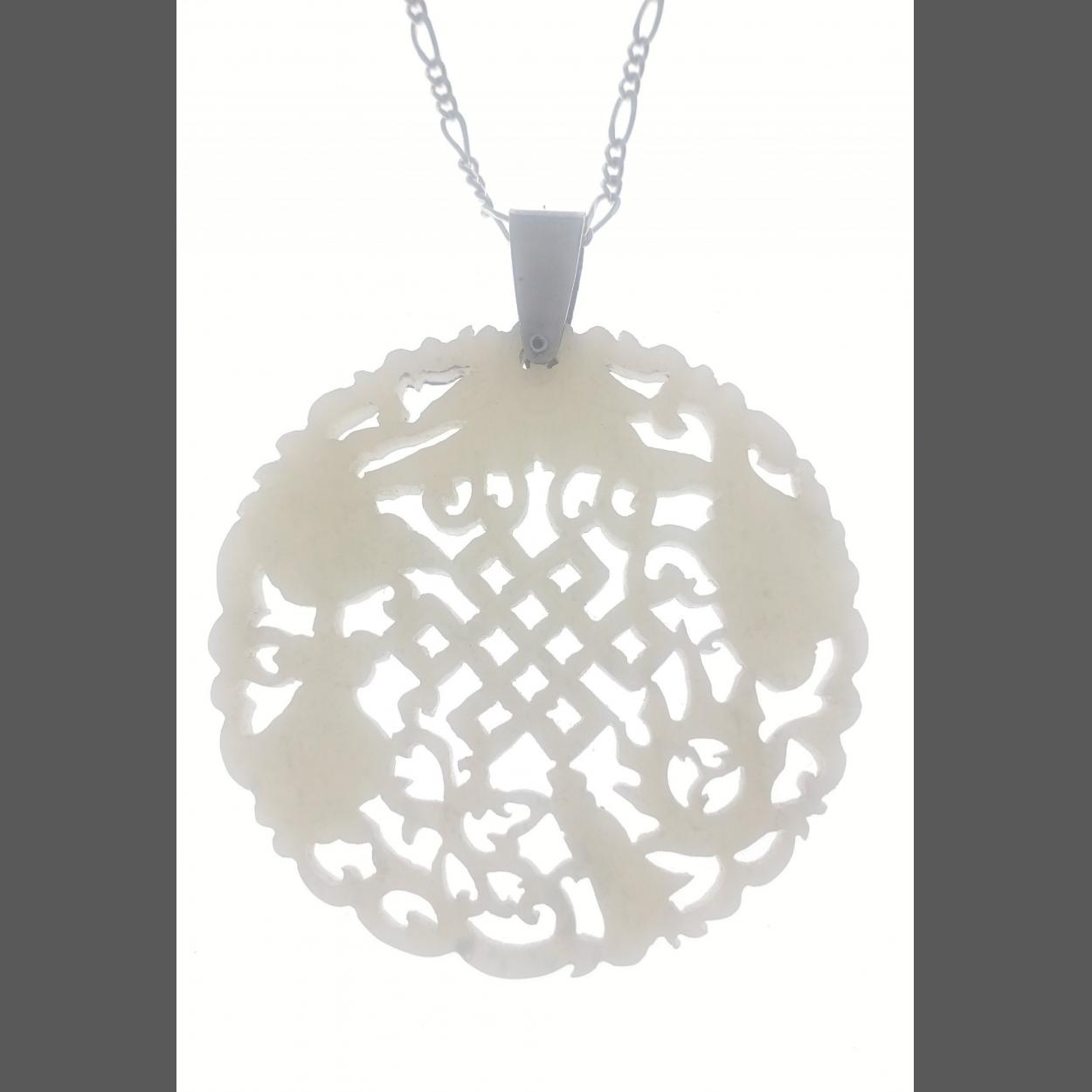 An Oriental carved JADE pendant (dia 5cm approx) on a white metal chain approx 46cm long, gross weight 27.45g approx