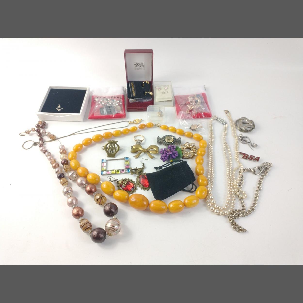 A mixed bag of costume jewellery to include Philip Jones, beads, earrings etc