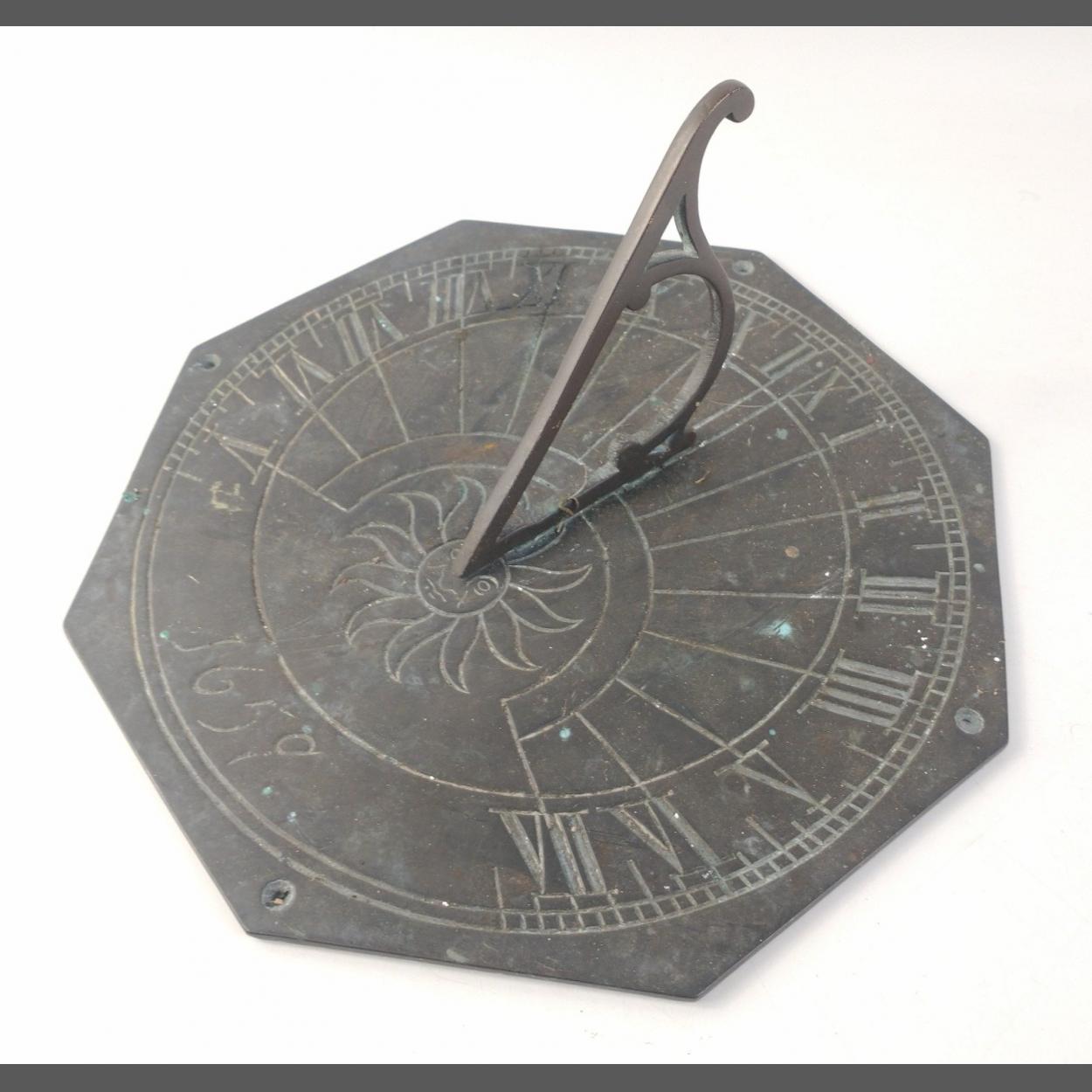 An octagonal brass sundial marked 1659 with sun motif and Roman numerals. Approx. 26cm in diameter.