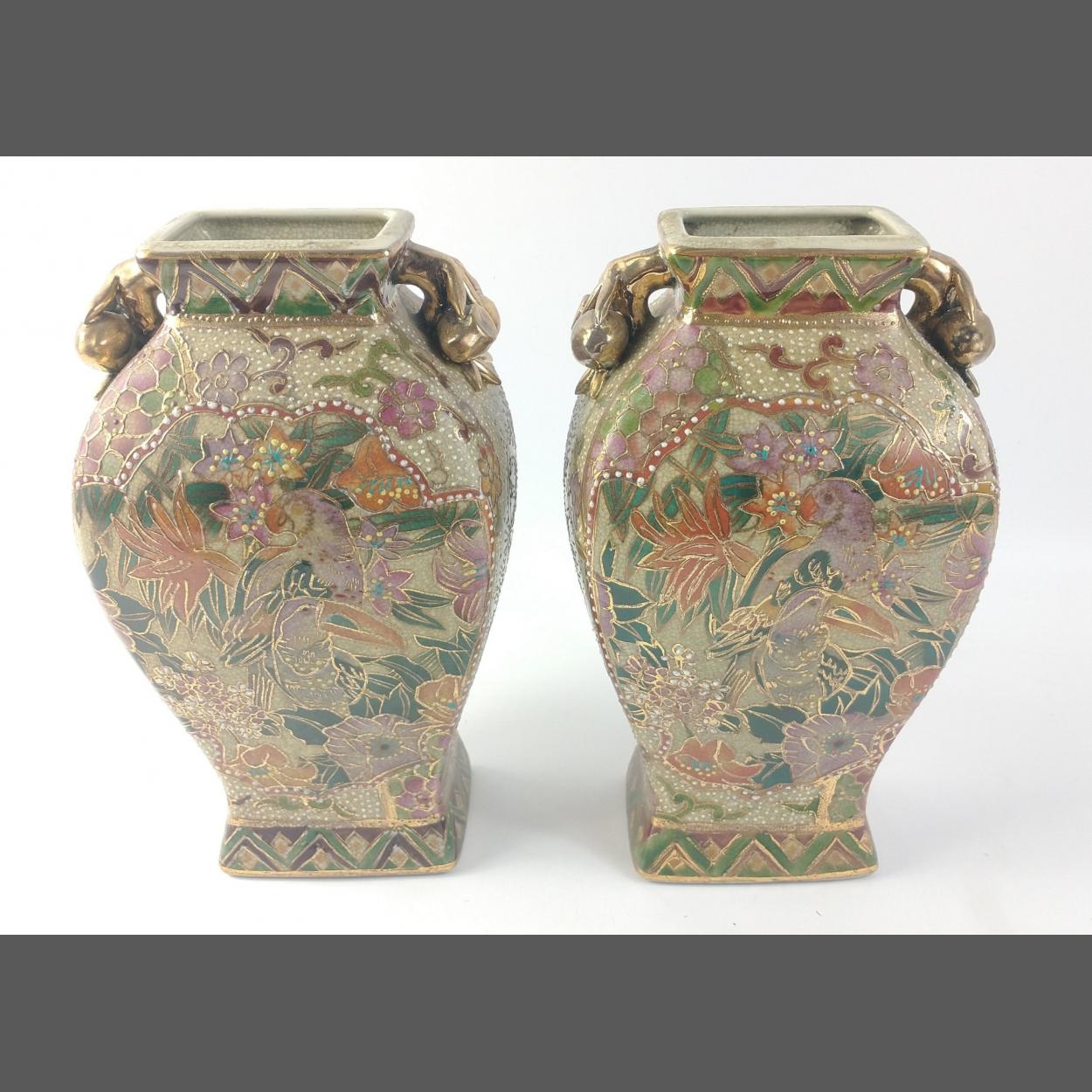 A pair of highly decorated oriental hand-painted vases with parrot/tucan and floral motifs. Approx. L12cm x W9cm x H21cm.