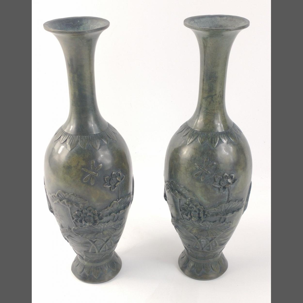 A pair of elegant (possibly spelter) oriental vases with lovely green patina and delightful water lily, fish, water and dragonfly motifs. Approx. 9cm in diameter and 25cm tall.