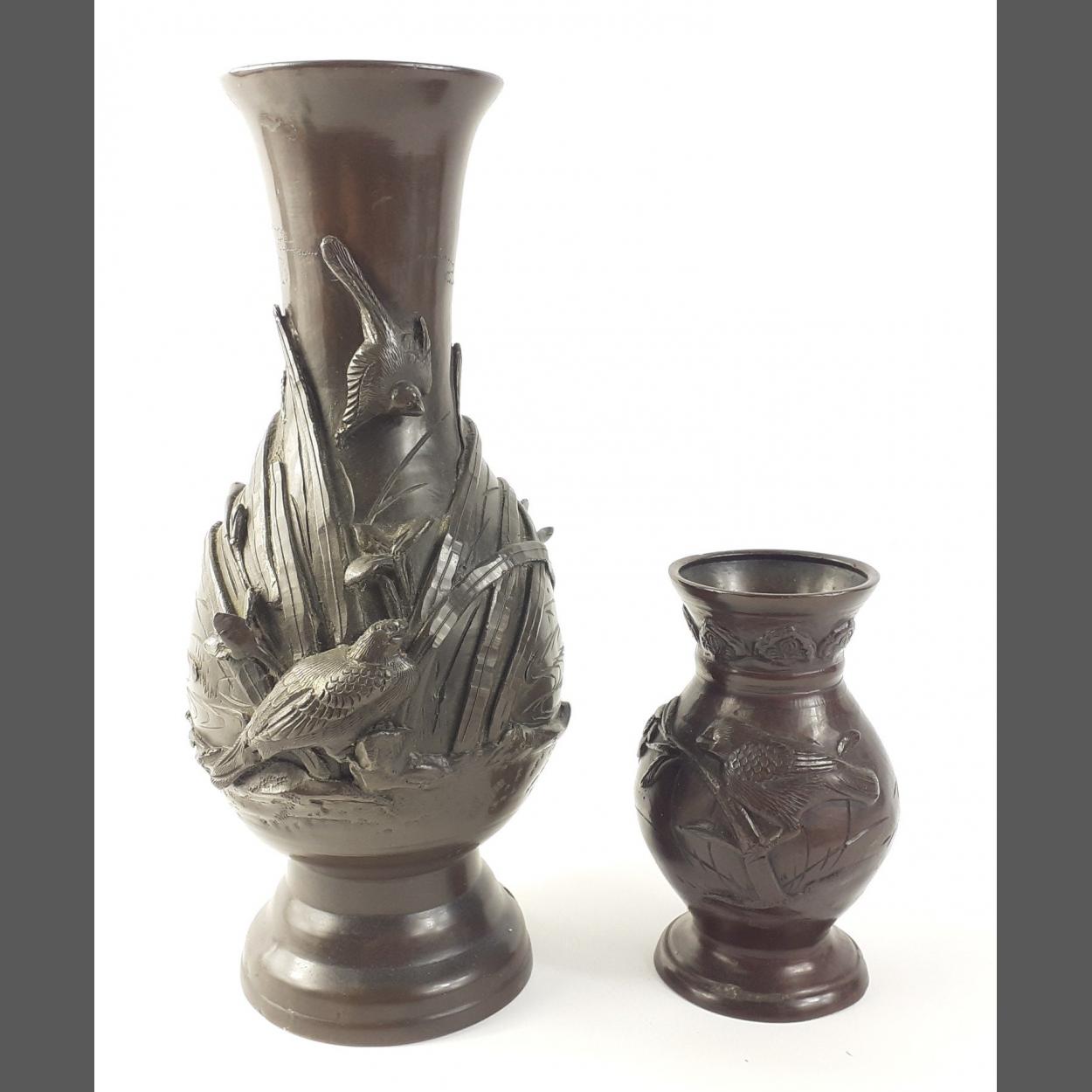Two oriental style bronzed vases with bird decoration taller 25cm, smaller 12cm tall approx.