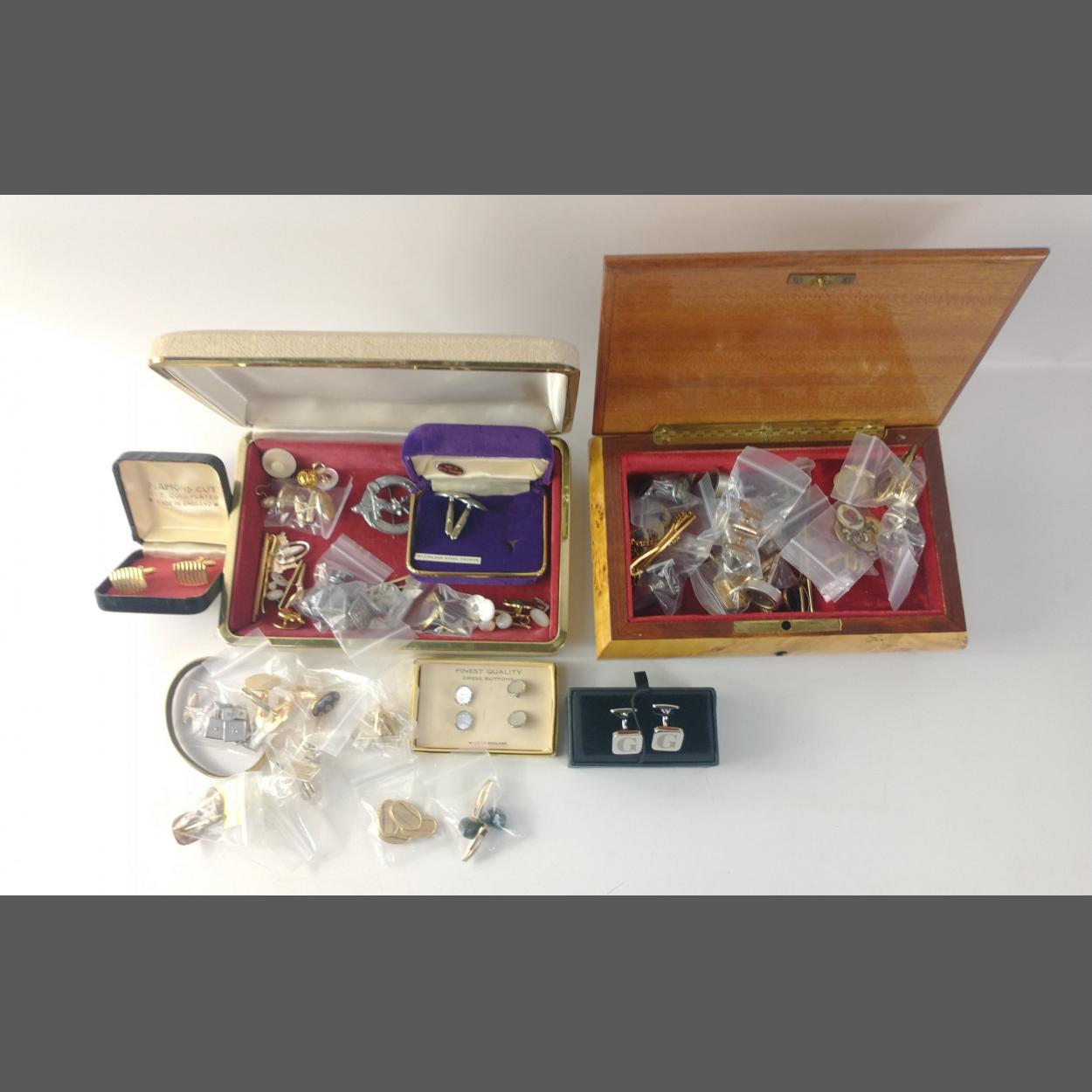 Two jewellery boxes, one a music box, stuffed full of cufflinks