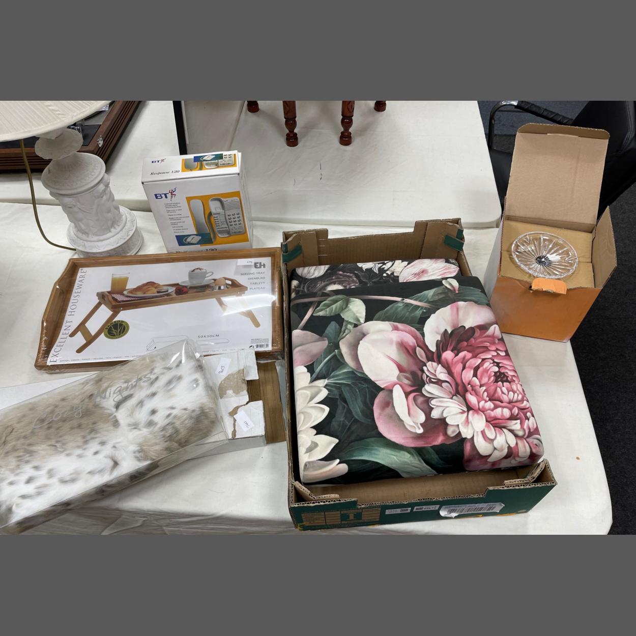 A household lot, all new items, to include - perfect for weekend lounging in bed - a bamboo serving tray (50cx30cm), a super furry hot water bottle, a BT RESPONSE 120 answer telephone, a NACHTMANN lead crystal box and 2 foldaway storage boxes/stools (fold down to 37x37x6cm) and move your settee with ease using these furniture sliders