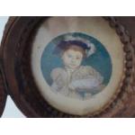 A wooden framed miniature portrait of a young Charles Brandon son of the 1st Duke of Suffolk by BARTOLOZZI after HOLBEIN. Dated 1795 to label on rear. 10cm tall in frame. The frame is beautifully intricate and the portrait well executed.