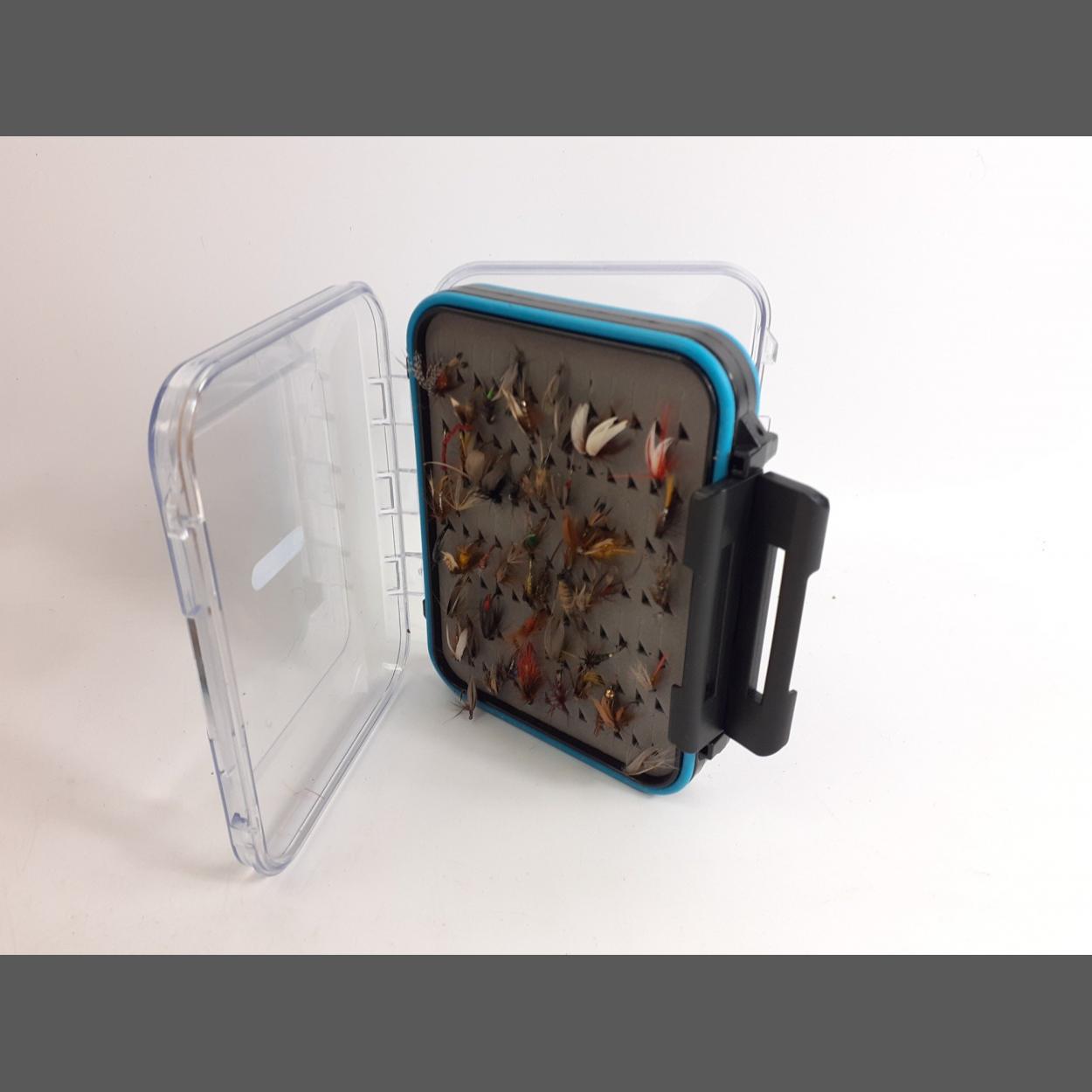 A see through double sided Rovex plastic fishing fly box containing 80+ wet trout flies.
