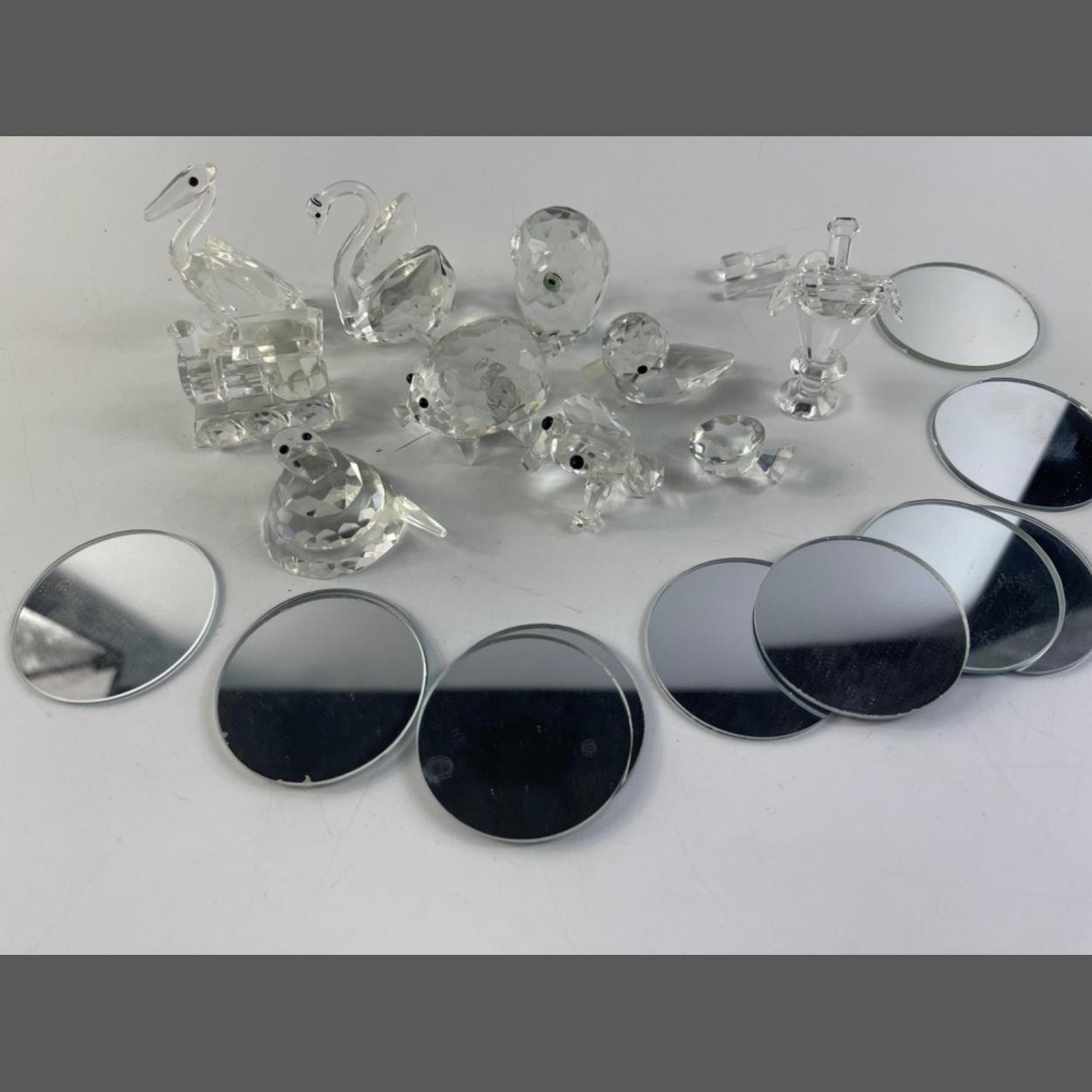 A collection of small crystal animals with mirror stands to include a swan, pig, pelican, frog etc all from a HARRODS shopping bag