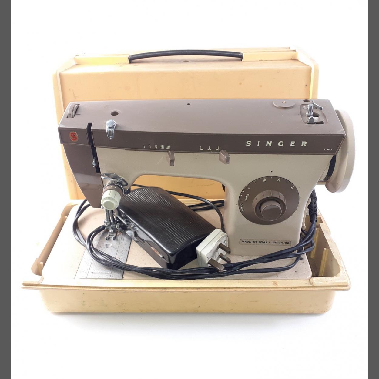 A Brazillian made SINGER sewing machine in hard plastic case. Model n. L47. Case has some damage.