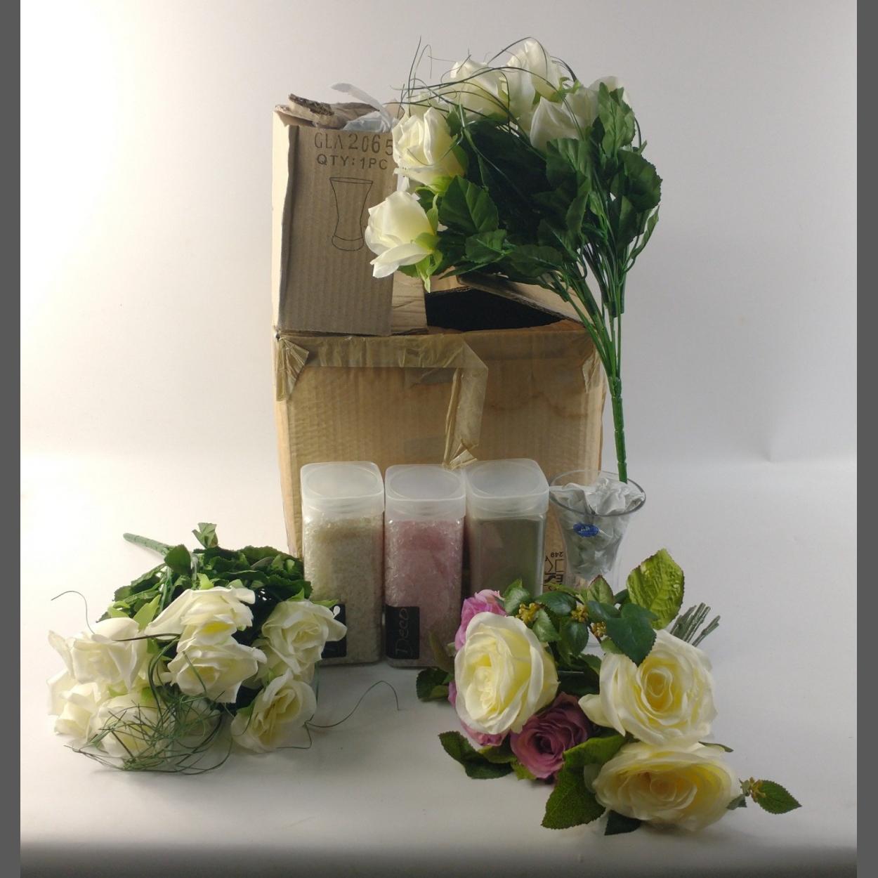 A box of silk roses complete with 2 vases and glass nuggets, all new, also suggestions for making floral arrangements