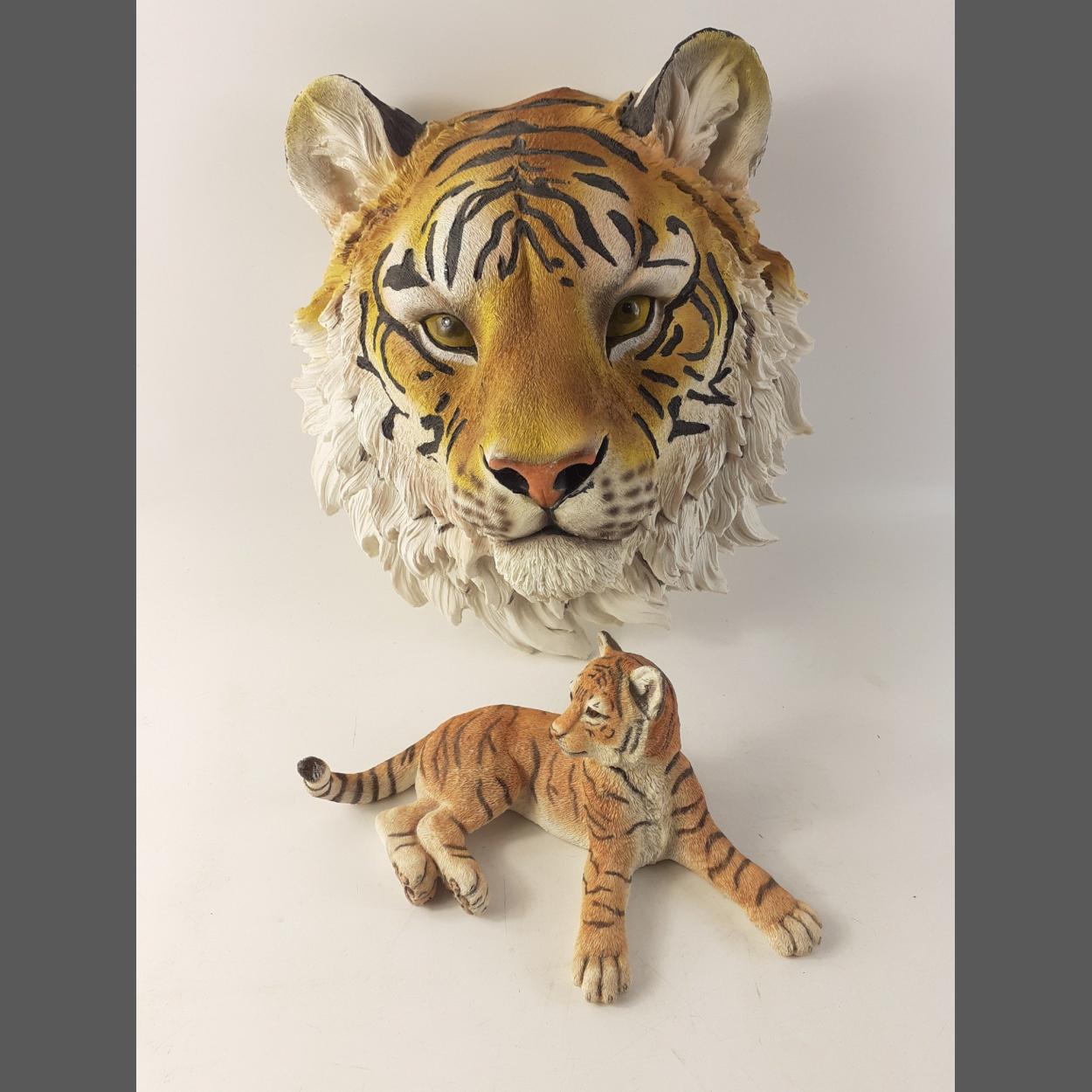 A wonderful plaster wall mask of a TIGER'S HEAD, 26cm approx and in very nice condition. Lot includes a COUNTRY ARTS hand painted lying Tiger Cub.