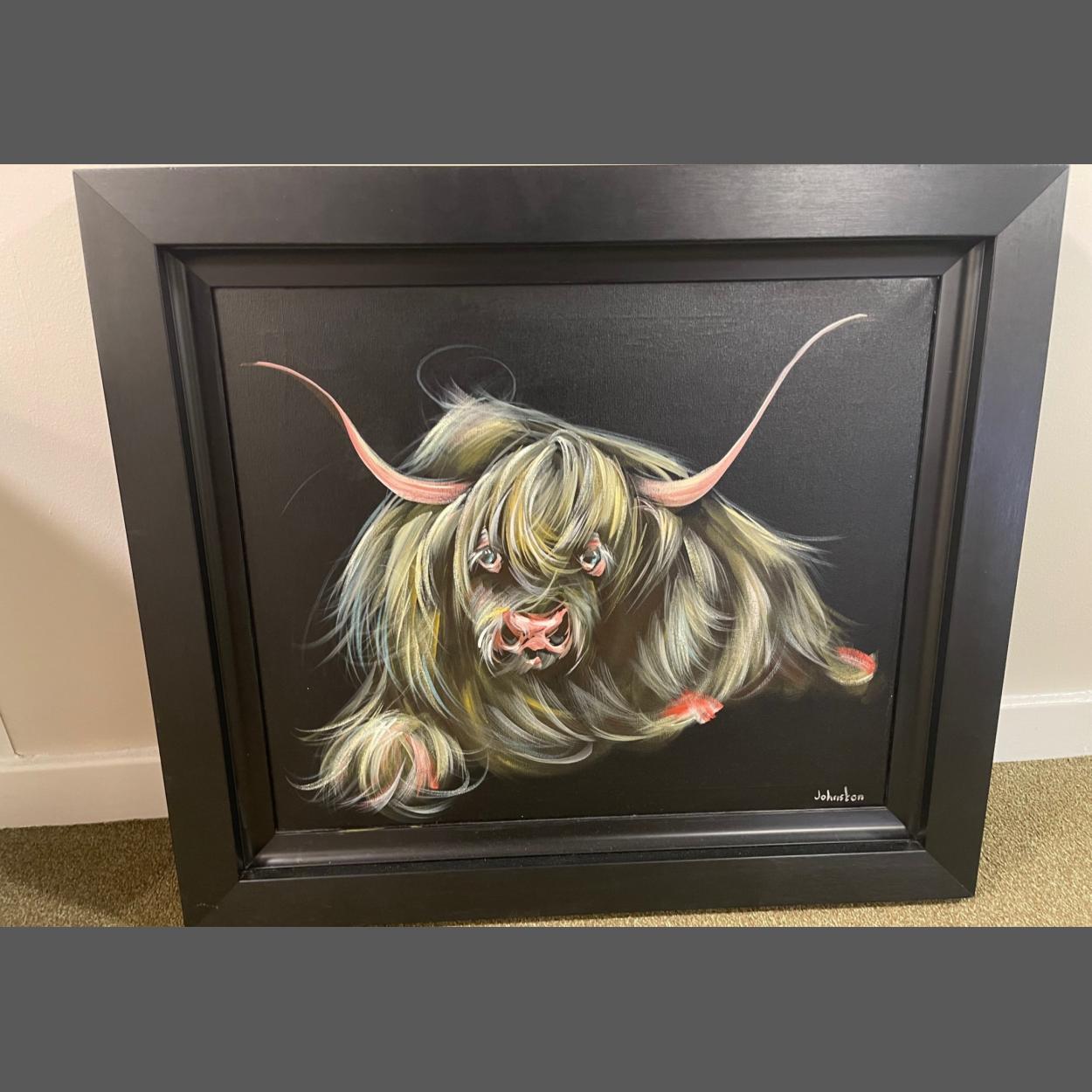 Original artwork on canvas by JOHNSTON with a colourful Highland Coo on a black background - frame size 65cm x 75cm - cost new £770