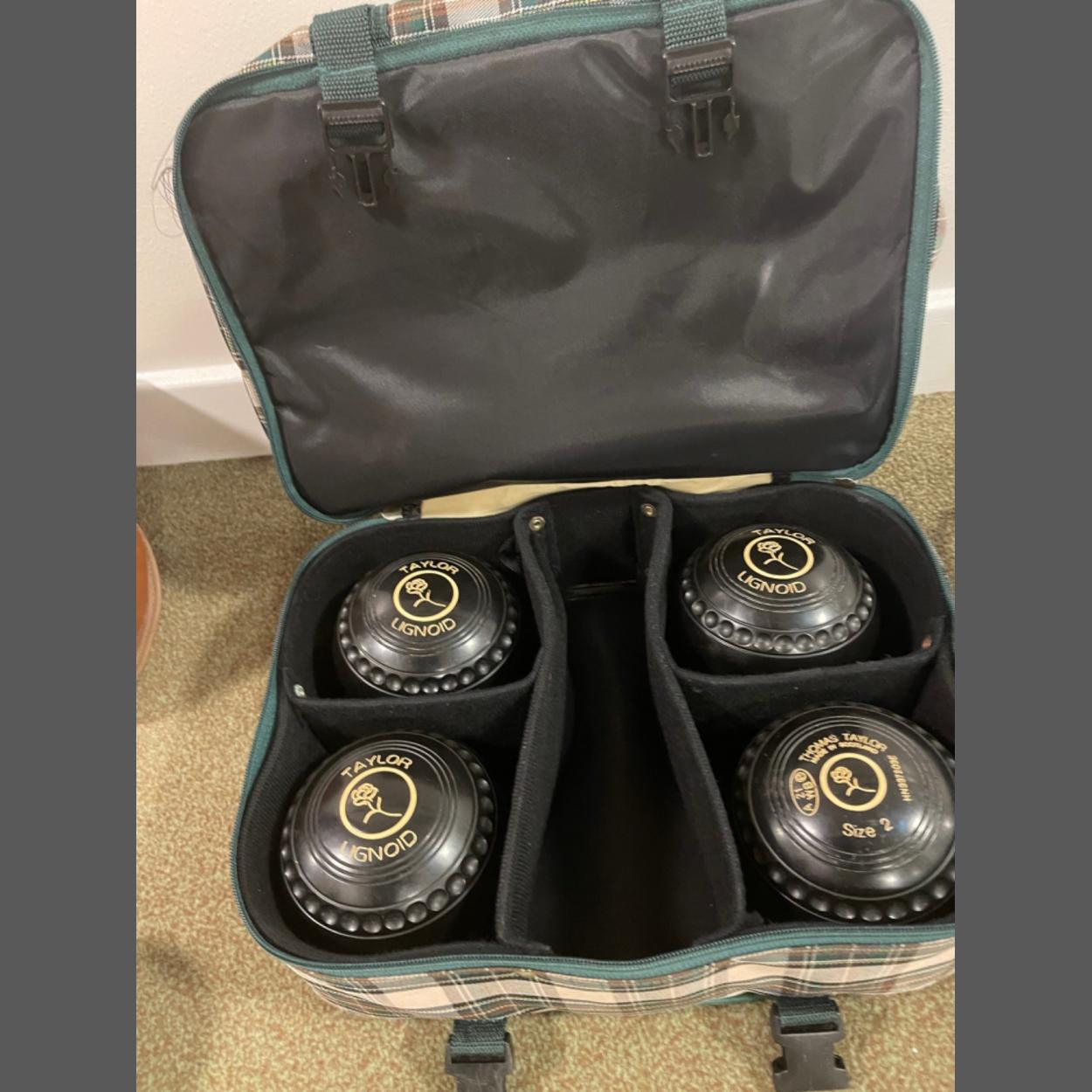A set of 4 THOMAS TAYLOR LIGNOID lawn bowls size 2 with carry case