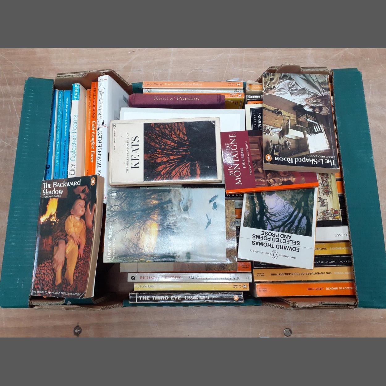 A box full of English Classics plus works of English criticism many Penguin orange or black spine