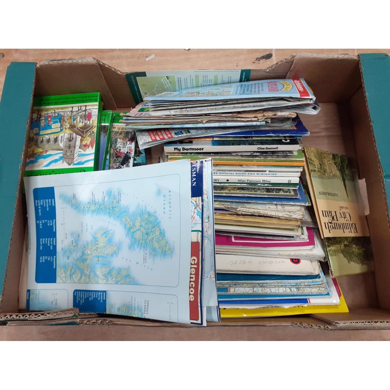 A box of old foldaway maps including tourist maps of the Lake District plus many Scottish maps and several editions of the Countryman