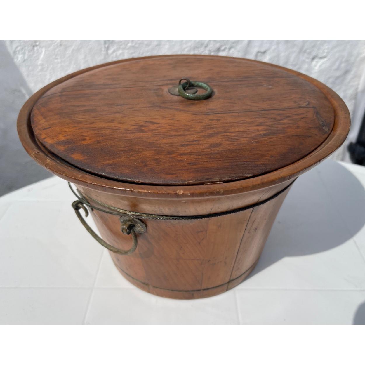 A vintage Chinese bamboo rice bowl with lovely patina and metal handles, brought back from Hong Kong measures 28cm approx across the lid and stands approx 17cm high