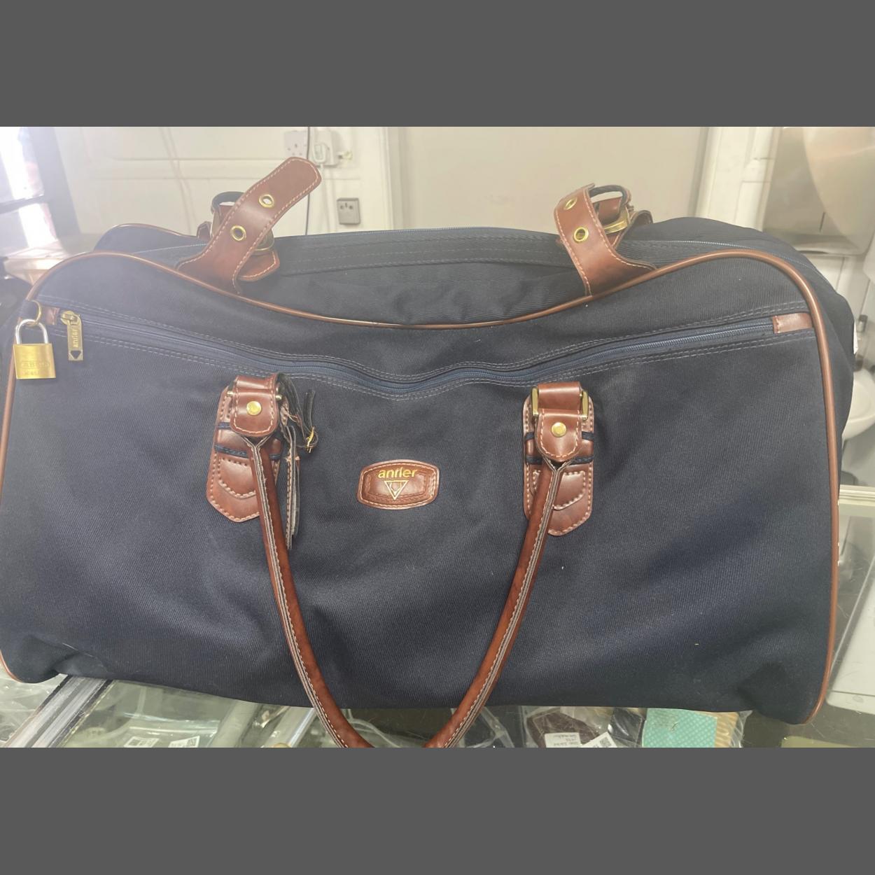 An ANTLER quality weekend bag in navy blue with tan leather trim with zipped outside compartment. In excellent condition - 2ft long approx