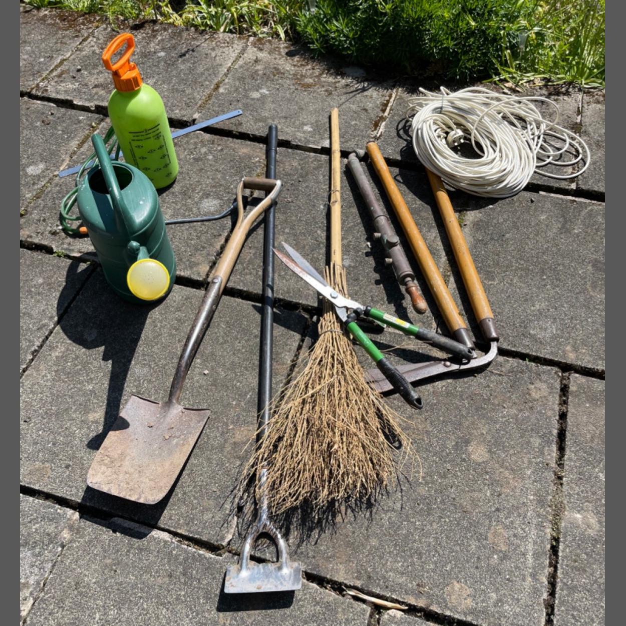 A collection of useful garden tools to include a watering can and green sprayer etc