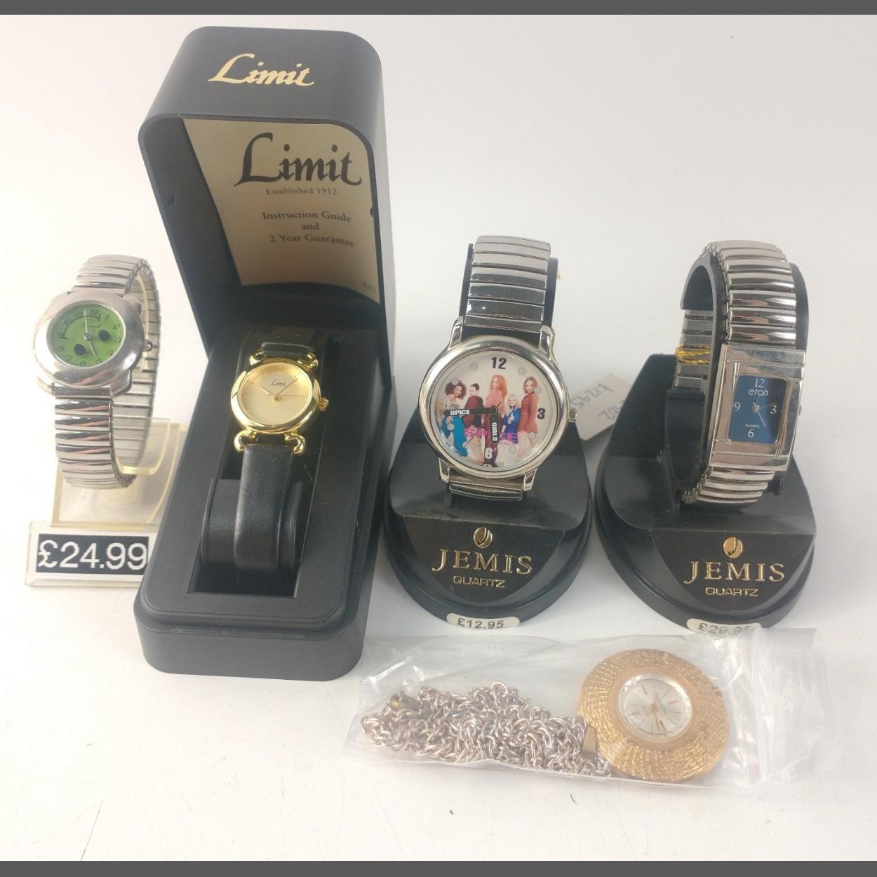 A mixed collection of 5 watches, including a yellow metal pendant watch and Spice Girls watch to include watch makers such as Jemis Quartz and Limit.