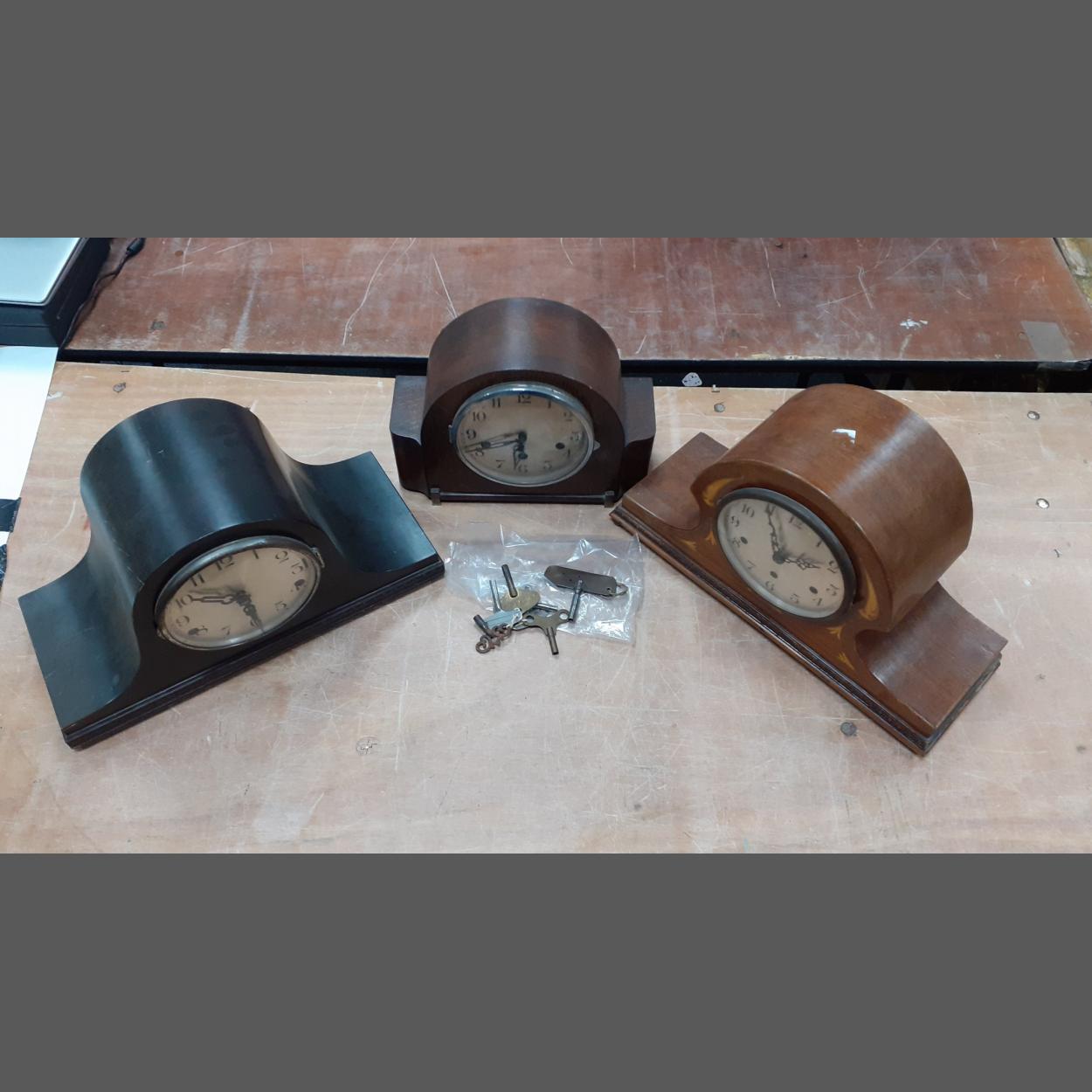 Not one but THREE vintage wooden-cased mantel clocks plus a bag of winding keys