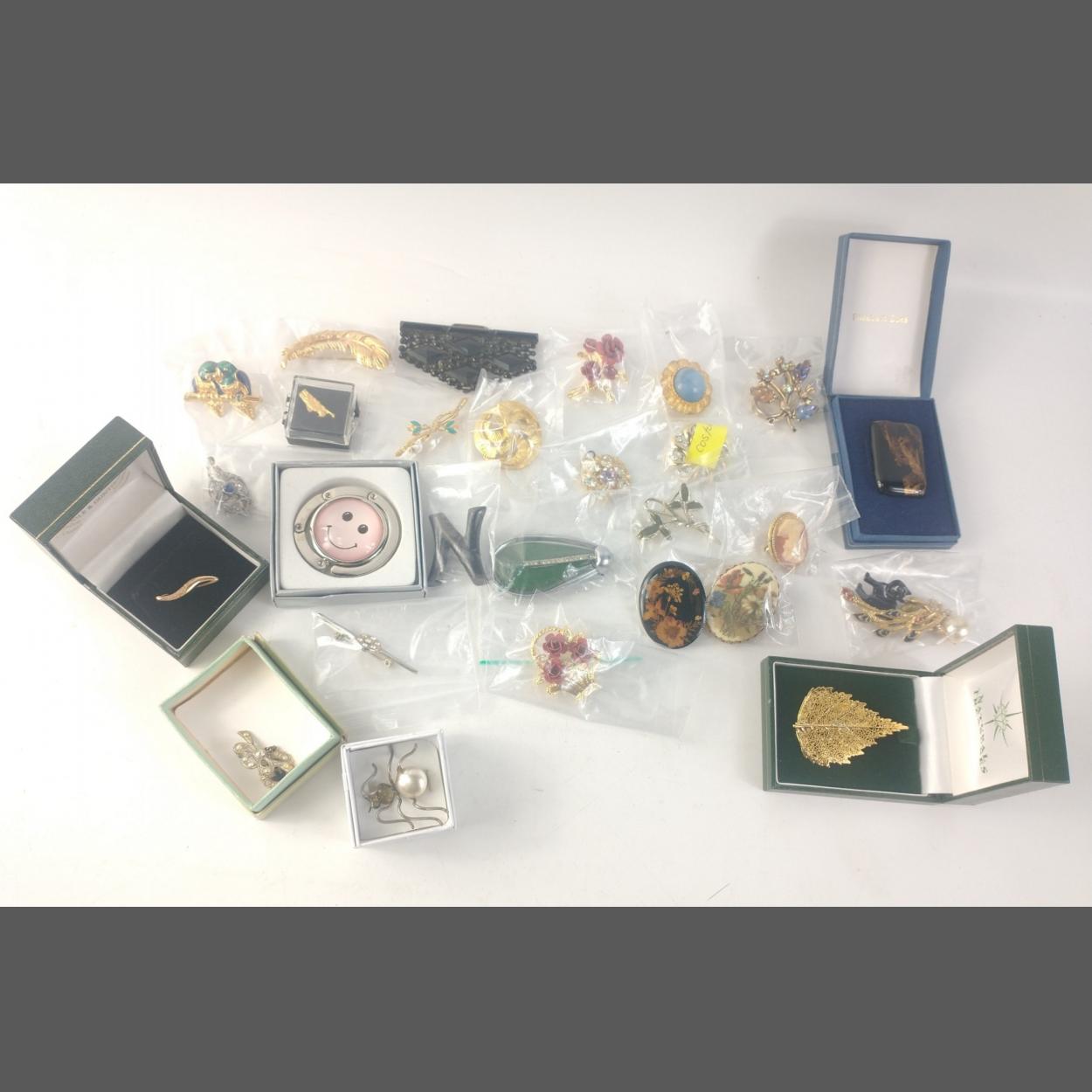 An attractive collection of costume brooches and pins of varying size and materials. Some boxed.