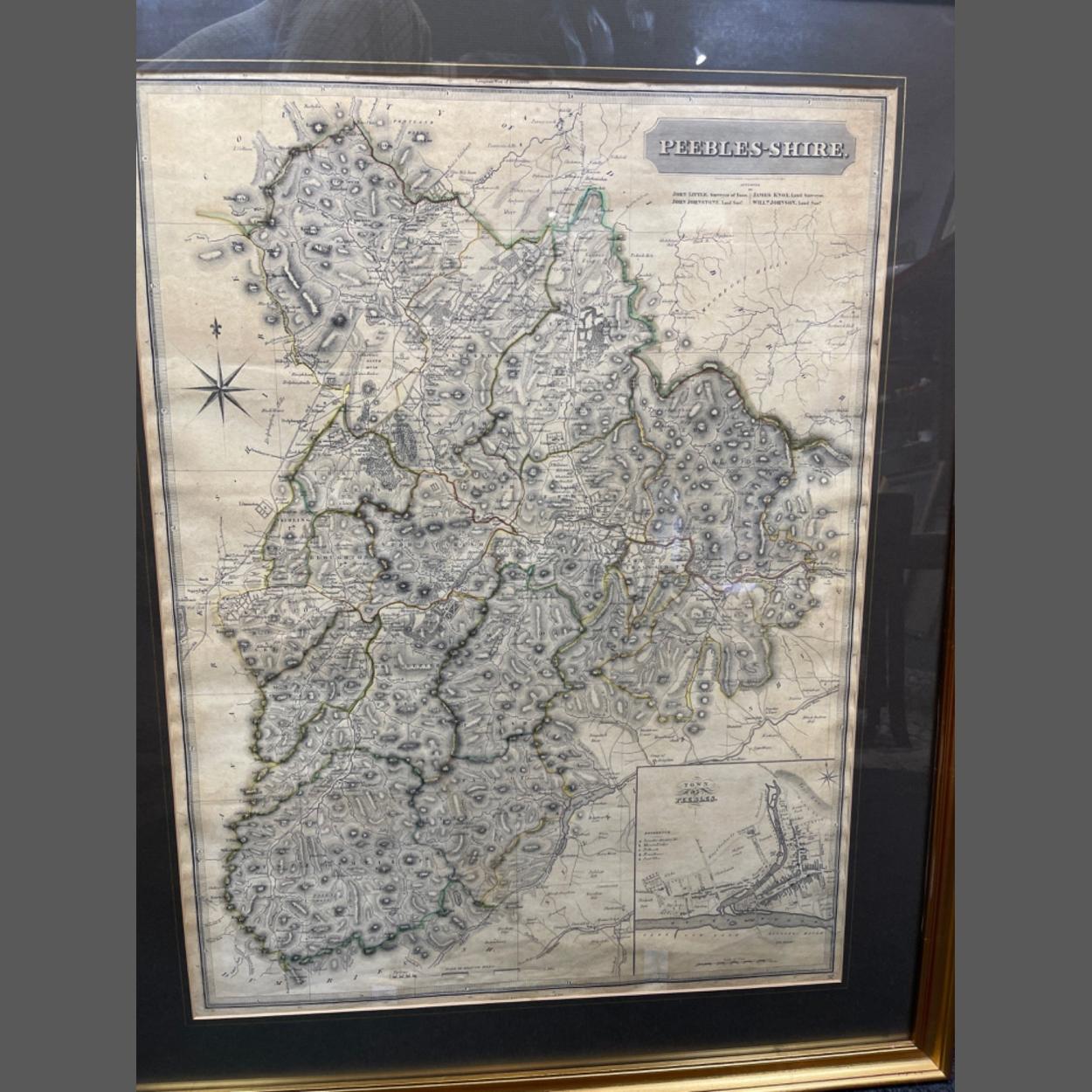 Drawn by Wm Johnson Land Surveyors and engraved by WD Assuville of Edinburgh to also include The Town Of Peebles bottom right of map inset - map dimensions 53cm x 70cm and frame size 72cm x 90cm approx