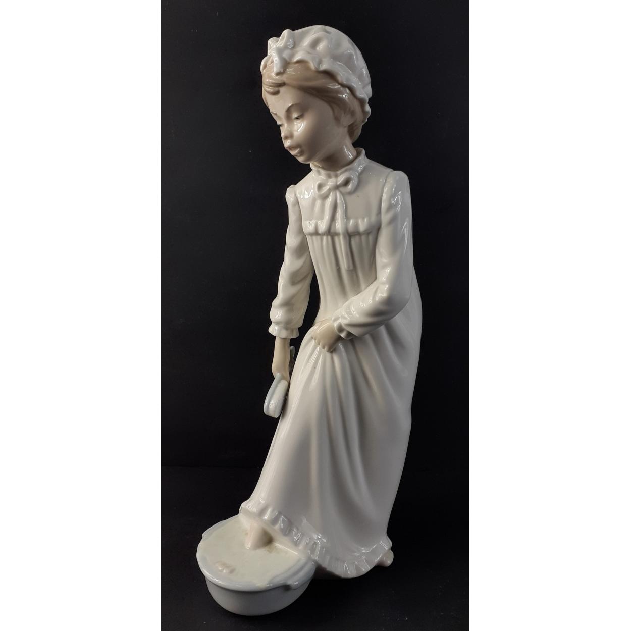 A NAO figure of a girl washing her feet and readying herself for bed, standing 29cm high approx. No chips, cracks or visible damage