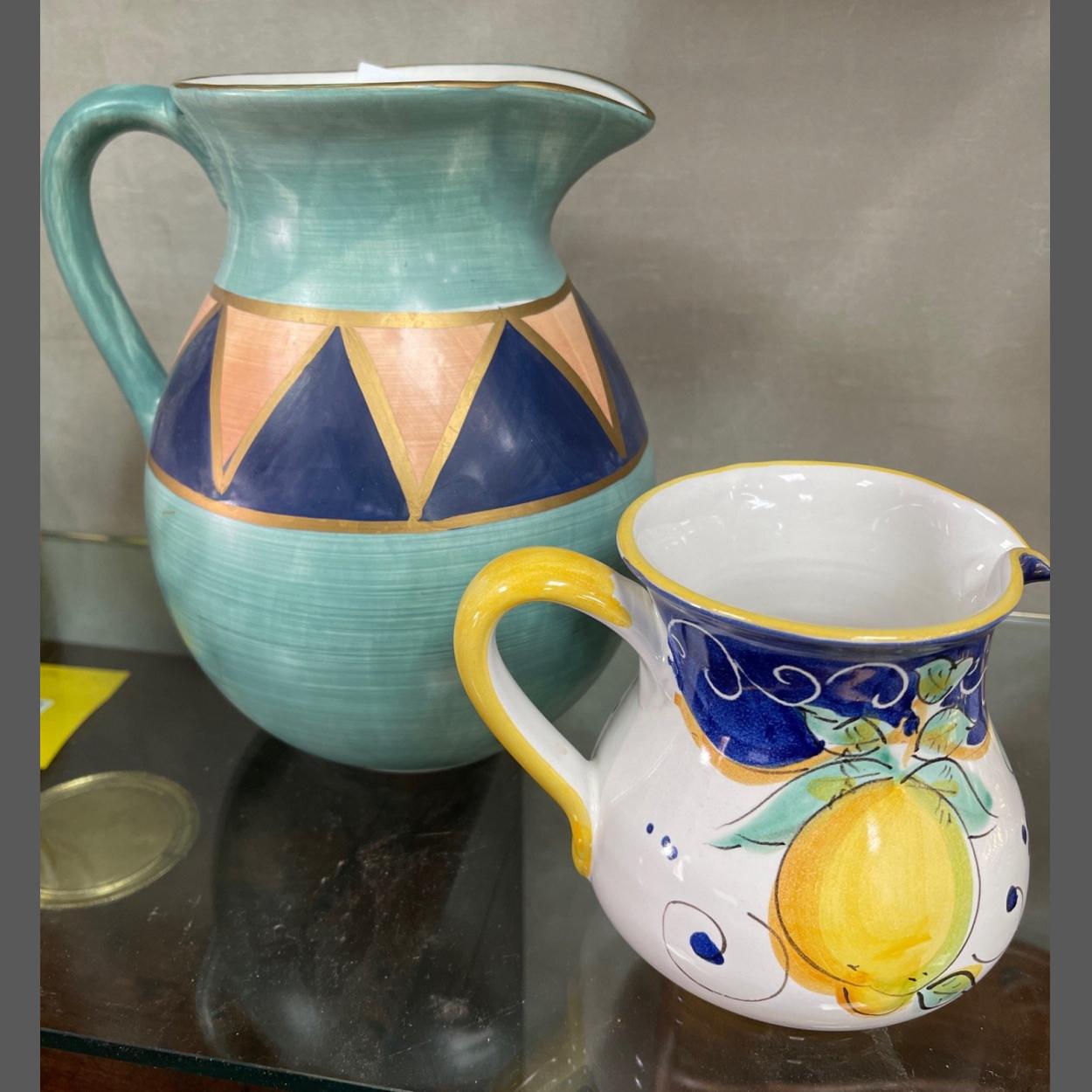 Two beautiful hand-painted and elegantly shaped jugs. The larger jug is approx. 20cm in diameter and 22cm in height painted in Kabul Green, dark blue and light terracotta. The smaller jug is of Italian origin and measures approx. 15cm in diameter and 12cm in height.